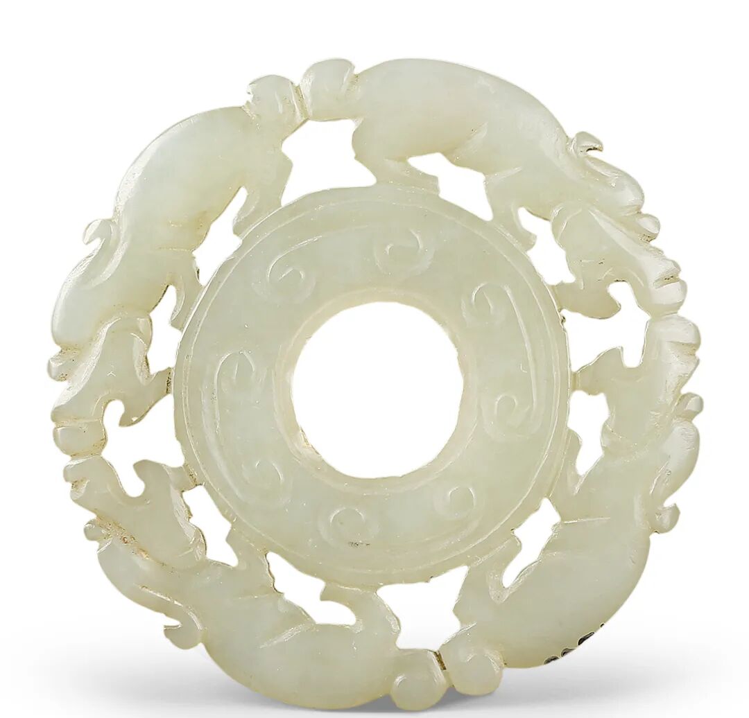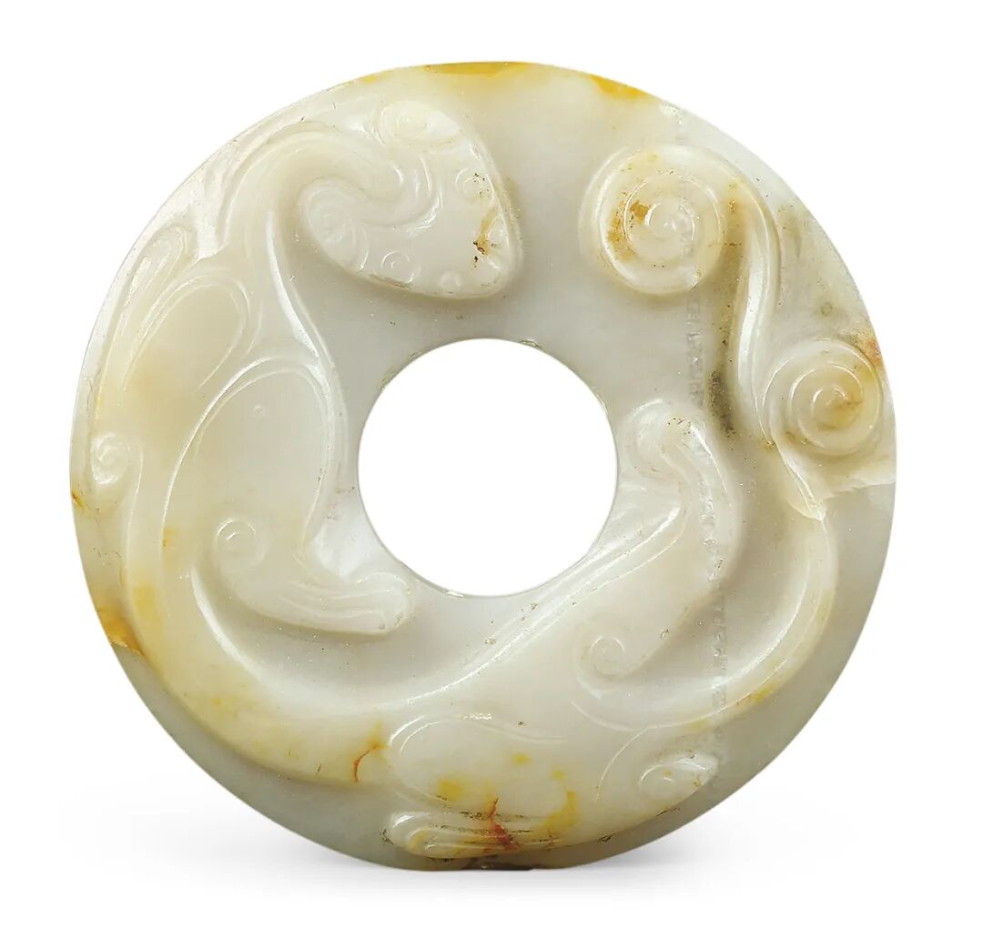 直径6.0、厚0.5厘米。玉质为青玉,内有凹槽应为活心璧,璧心征集时即已遗失。玉璧外廓雕琢四龙,两龙吻部相连,两龙双尾相接,龙体为透雕,璧体阴线刻四个卷云纹,两面纹饰相同。