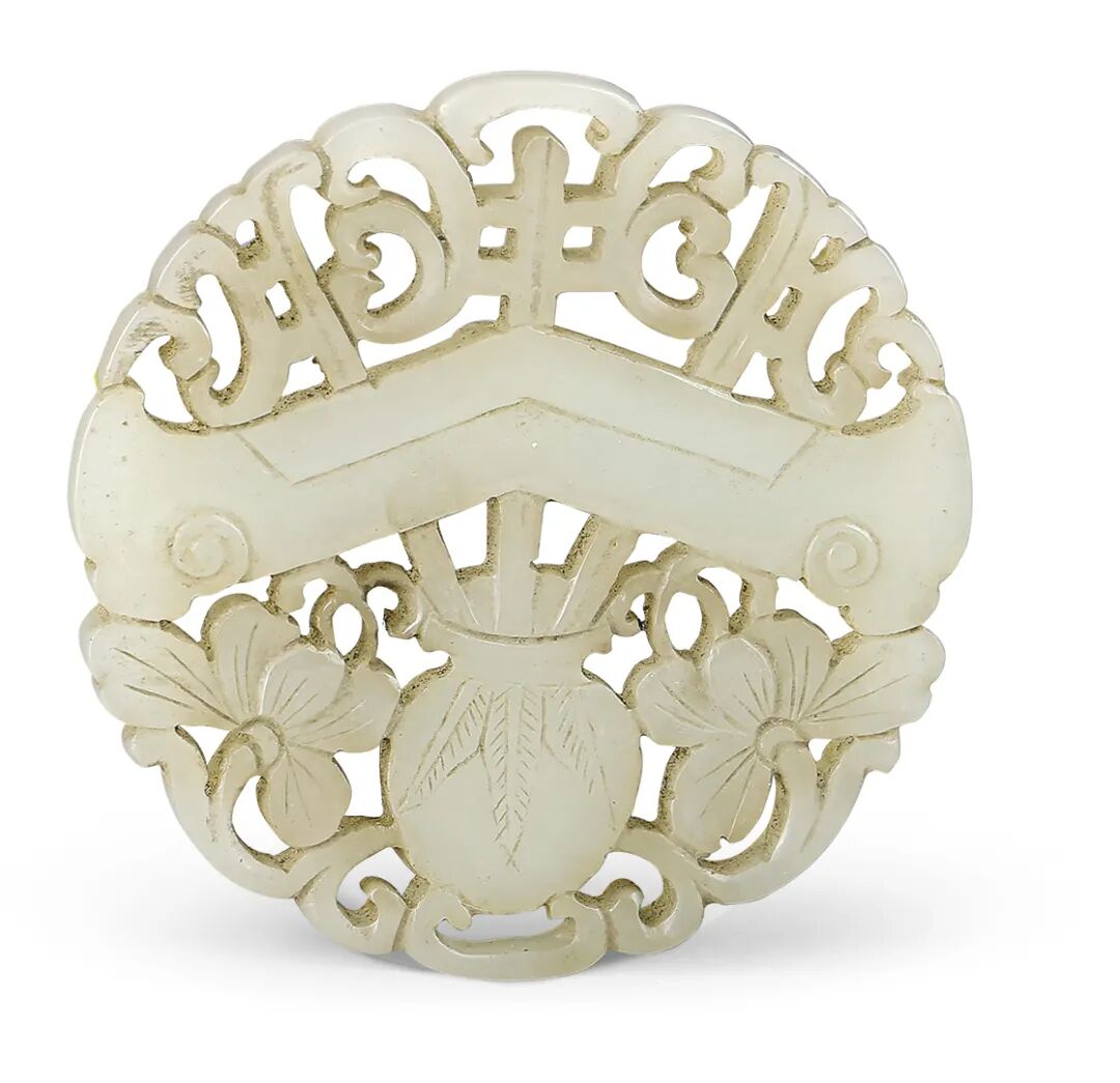 直径5.6、厚0.5厘米。白玉质,玉质莹润,通体无瑕。呈椭圆形,整体镂空,底部一宝瓶插花,中部有一磬,其间饰花草,寓意“平安吉庆”。