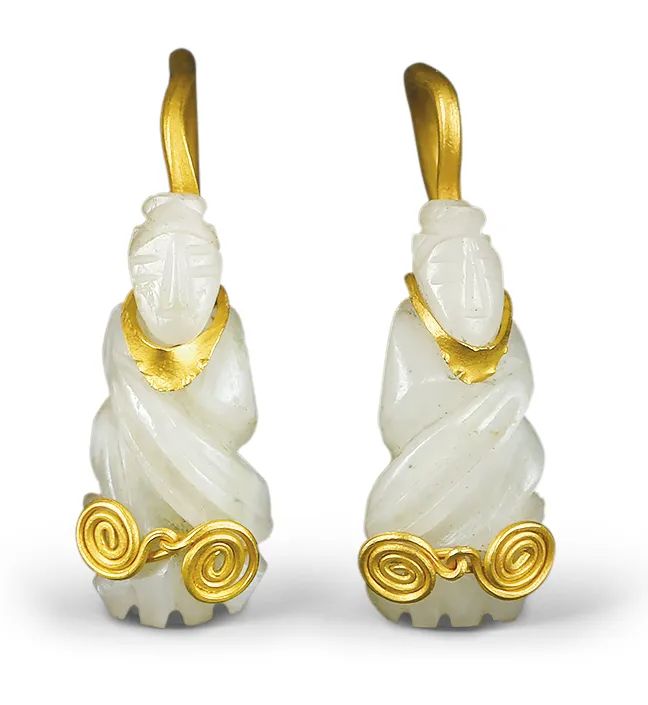 1982年12月滕州出土。通高3.3、玉人高2.7、宽1.1厘米。耳坠金丝镶嵌,主体为青白玉质玉人。玉人呈褒袖跽坐状态,头梳高髻,瘦长脸型,阴线刻五官,身着长袍,一为右衽,一为左衽。