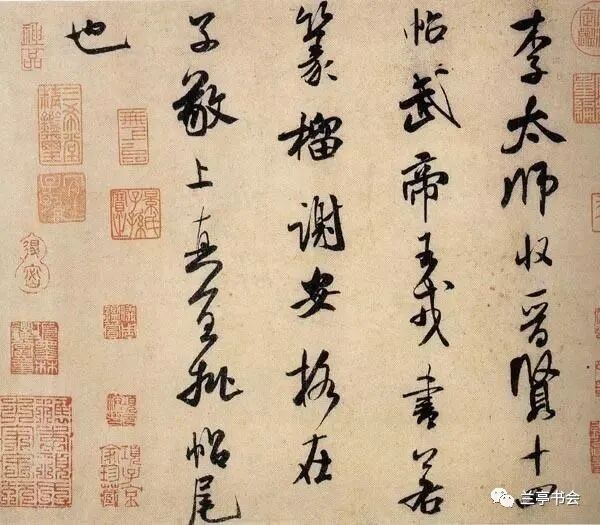 比较米芾对于王氏父子二人书法评价之语词,如对于羲之,其评《王略帖》『笔法入神奇绝』、《千字文》『笔力圆熟』;对于献之,其评《十二月帖》『如不经意』、《苏氏宝帖》『灵襟疏,冲韵迈』并泛泛而评之『天真超逸』等等。从这些略有不同之着眼处皆可窥米芾所推崇之书法格范以及其更为欣赏大令书之所在。米芾多写行书,传世草书《论书帖》便是其追尚晋人之直接显现。在帖中,其谓『草书若不入晋人格,辄徒成下品』,从而表明其不论楷、行、草等书体而皆以晋人格致为风标之书学观念。米芾在太师李玮家曾见其收《晋贤十四帖》,应请为之题『李氏法书第一』,其在《书史》中亦为此注为『亦天下法书第一也』[27]句。在晋人中,米芾虽对王氏父子尤为推崇,且谓小王在大王之上,不过其对谢安却是评价最高,谓之《慰问帖》『字清古,在二王之上』[28],而其《李太师帖》更有如此之言:李太师收《晋贤十四帖》,武帝、王戎书若篆籀,谢安格在子敬上。真宜批帖尾也。[29]