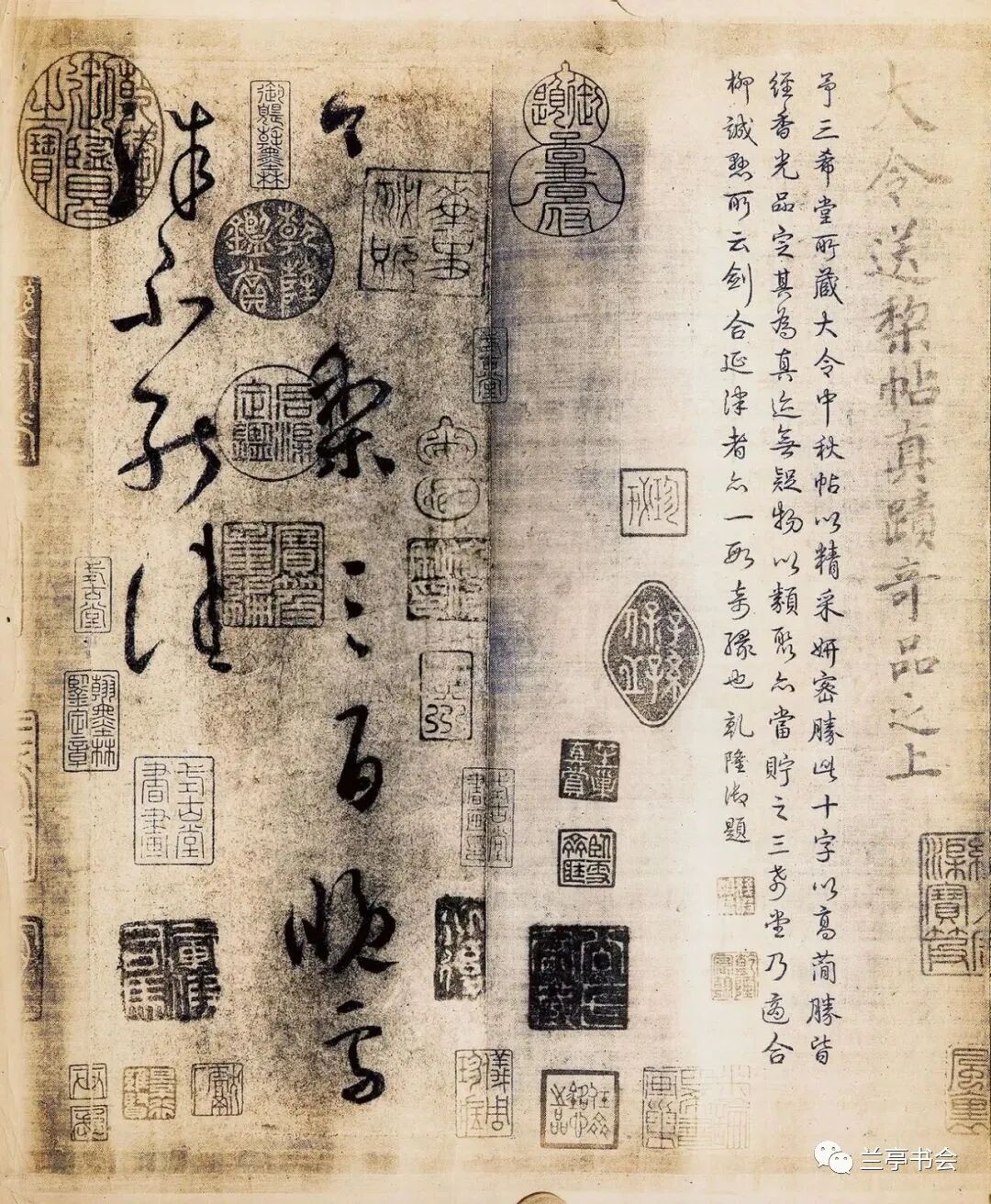 于此中可知,仅苏家即有三本《快雪时晴帖》,而右军予他人手札,出之以三本于世则颇有难解处,故三本之中必有摹本甚至全为摹本。此为『君倩』者,米芾疑是梁秀,而其人除米芾略有提及外,在今之艺术史及鉴藏史上已是难寻其迹。故无论君倩还是梁秀,以现存之文献与实物材料皆难以详考。至于《快雪时晴帖》上之『褚氏』印及米芾『是褚令所印』语,张光宾解为是褚遂良之孙褚令,而穆棣论为『褚令』即是褚遂良。史上以『褚令』而谓褚遂良颇多其例,如同为宋人,『苏门六君子』之一的李廌(一〇五九——一一〇九)在《题蔡君谟墨迹后》即有『褚令狷且直』句。而张光宾之论,则应是来自于《清河书画舫》中所录之米芾《快雪时晴帖》跋语: