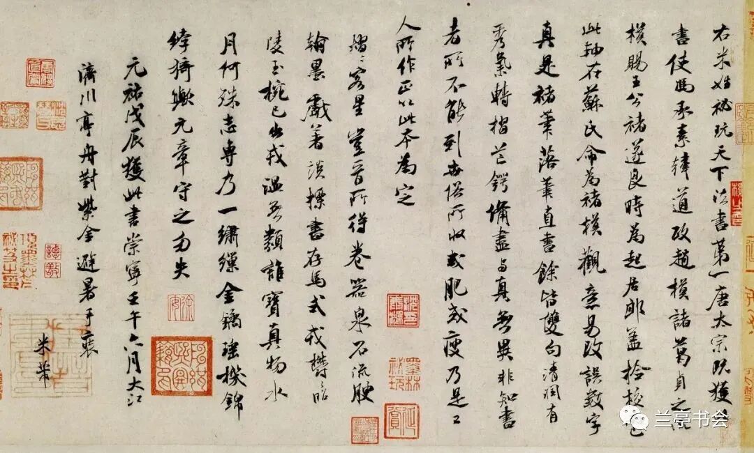 米芾之《兰亭序》收藏,在其《书史》《宝晋英光集》及桑世昌所著《兰亭考》中皆有记述。仅《书史》就提及梓州铜山苏家绢本与纸本、泗州南山杜家刻版本、宗室赵叔盎纸本、钱塘关家石本、刘泾绢本等多件《兰亭序》之唐摹(刻)本,而其中大多亦为米芾最后收得。在此所记诸本中,以梓州铜山苏家所藏最为详尽:苏耆家《兰亭》三本,一是参政苏易简题赞,曰:『有若像夫子,尚兴阙里门。虎贲类蔡邕,犹傍文举尊。昭陵自一闭,真迹不复存。今余获此本,可以比玙璠。』第二本在苏舜元房,上有易简子耆天圣岁跋,范文正、王尧臣参政跋云:『才翁东斋书,尝尽览焉。』苏洎,才翁子也,与余友善,以王维雪景六幅、李主翎毛一幅、徐熙梨花大折枝易得之。毫发备尽,『少』『长』字世传众本皆不及,『长』字其中二笔相近,末后捺笔钩回,笔锋直至起笔处。『怀』字内折笔、抹笔,皆转侧偏而见锋。『暂』字内『斤』字、『足』字转笔,贼毫随之,于斫笔处贼毫直出其中,世之摹本未尝有也。此定是冯承素、汤普彻、韩道政、赵模、诸葛正之流,拓赐王公者。碾花真玉轴,紫锦装背。在苏氏舜元房,题为褚遂良摹。余跋曰:『《乐毅论》正书第一,此乃行书第一也。观其改误字,多率意为之,咸有褚体,余皆尽妙。此书下真迹一等,非深知书者未易道也。』赞曰:『熠熠客星,岂晋所得。养器泉石,留腴翰墨。戏著标谈,书存焉式。郁郁昭陵,玉盘已出。戎温无类,谁宝真物。水月非虚,移模夺质。绣缲金鐍,琼机锦綍。猗欤元章,守之勿失。』第三本唐粉蜡纸摹,在舜钦房。第二本所论数字精妙处,此本咸不及,然固在第一本上也,是其族人沂摹,盖第二本毫发不差。世当有十余本,一绢本在蒋长源处;一纸本在其子之文处,是舜钦本;一本在腾中处,是归余家本也;一本在之友处。[2]于此可知苏家所藏三本《兰亭序》中,第一本上有苏易简(九五八——九九七)题赞;第二本在苏舜元(一〇〇六——一〇五四)处,上有苏易简子苏耆(九八七——一〇三五)于北宋天圣(一〇二三——一〇三二)年间题跋,并范仲淹(九八九——一〇五二)与王尧臣(一〇〇三——一〇五八)跋;第三本则归苏舜钦(一〇〇八——一〇四八)所有。就此苏家三本,米芾视以第三本在第一本之上,而第二本则最为精当,故于此所记亦最为详细。除其轴头裱背样式、别家及自家跋赞内容,其还说明此本乃是以王维、李煜及徐熙之数件画作而与苏舜元子苏洎交换得来。此外,米芾还对其中『少』『长』『怀』及『暂』等字用笔作以细致解析,从而指出此与其他传世摹本皆有所不同,最后则论为当是唐冯承素等人所手拓之本。米芾《书史》中所记苏家三本《兰亭》,除苏舜钦所有之第三本唐粉蜡纸摹本在后世似再未有现外,第一、二本皆相继为其后著录提及。如桑世昌在《兰亭考》卷五中所记汪家藏本中之一本即是苏家旧藏第一本:司业汪氏所藏唐人临本有四,其一绢素本,苏太简璠字韵诗真迹,系衔其后云『翰林学士承旨中书舍人苏某于玉堂北轩题』。[3]