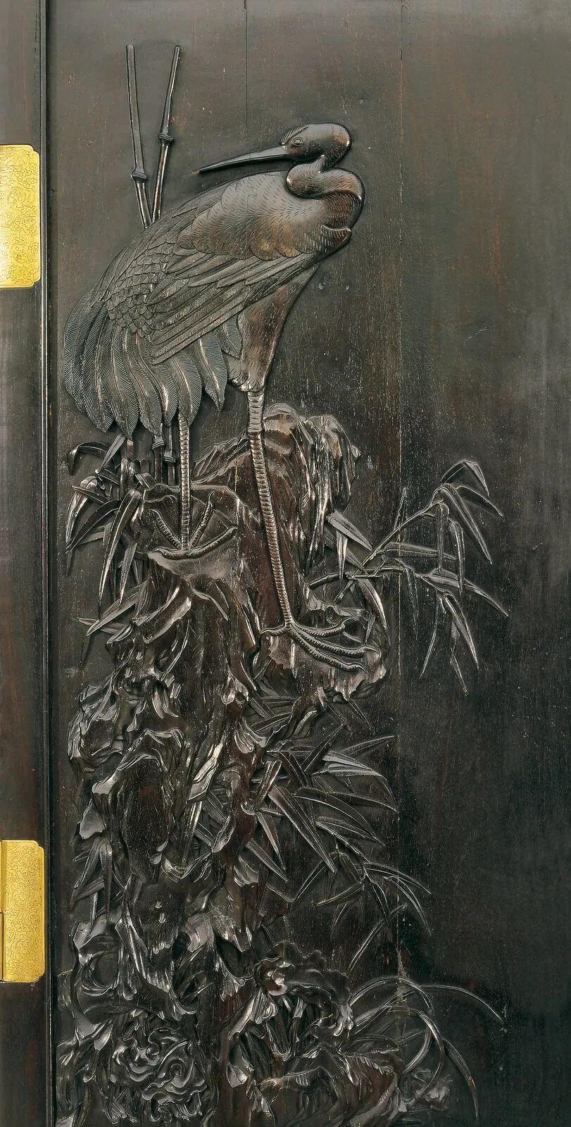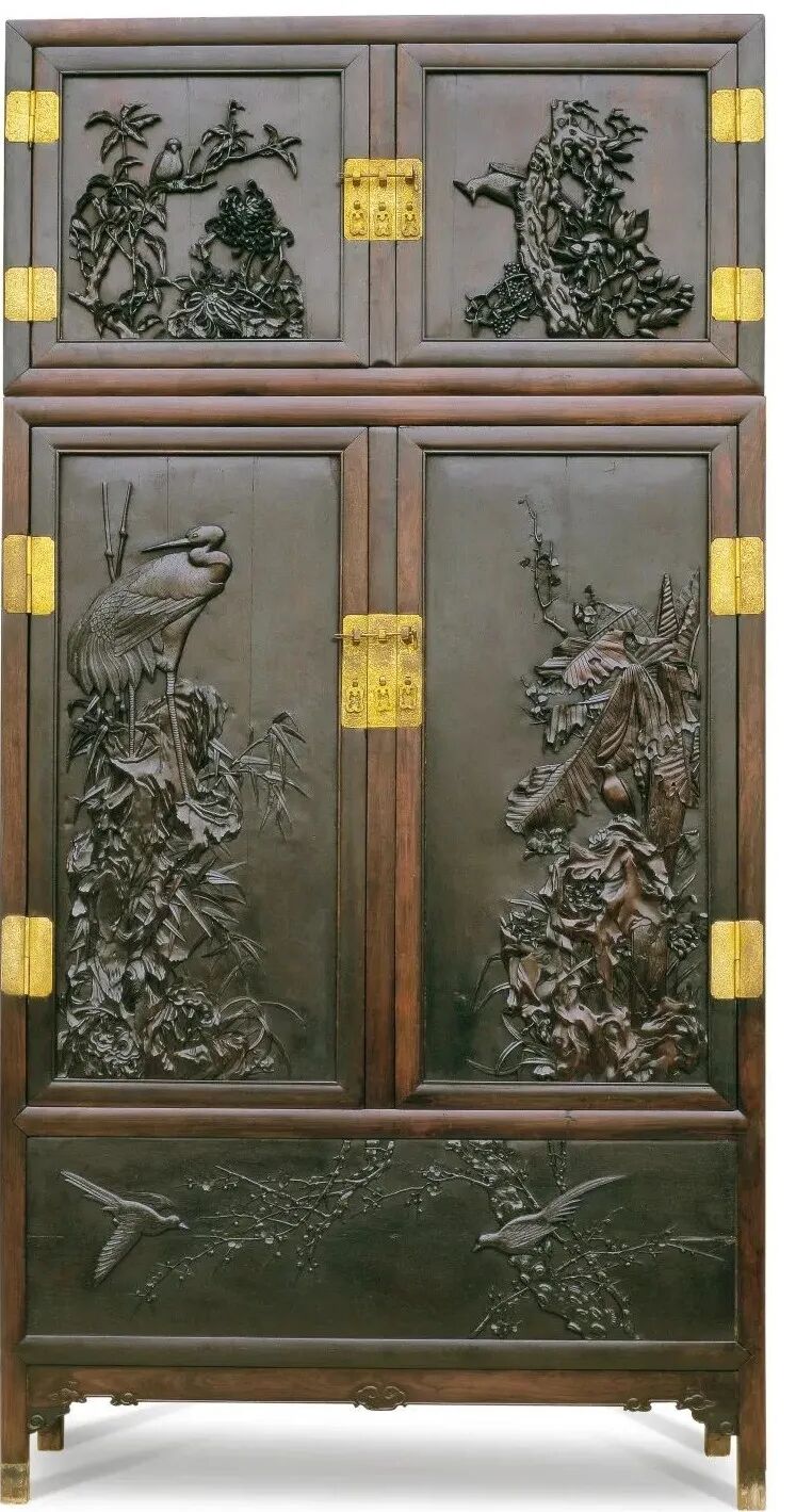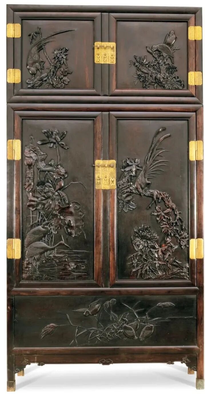 “清乾隆 紫檀花鸟纹大四件柜(一对)”也极为精彩,紫禁城皇帝与后妃寝宫家具中的数件紫檀大柜雕刻图案多为云龙纹和图案规矩、装饰化的博古花卉纹样,有的甚至以郎世宁花鸟画为蓝本刻成。