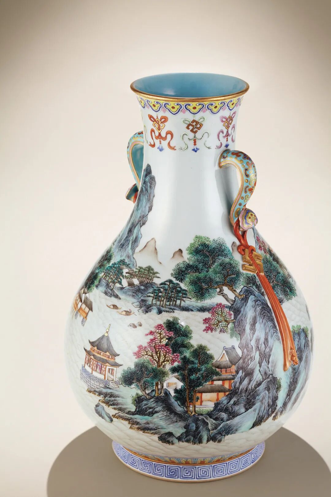 “清乾隆 御制洋彩江山万代如意耳琵琶尊”,双如意耳制作的精巧工致,如意首系有一装饰金彩“万”字的红色绶带,为乾隆时期精细御瓷琢器之显著标志。