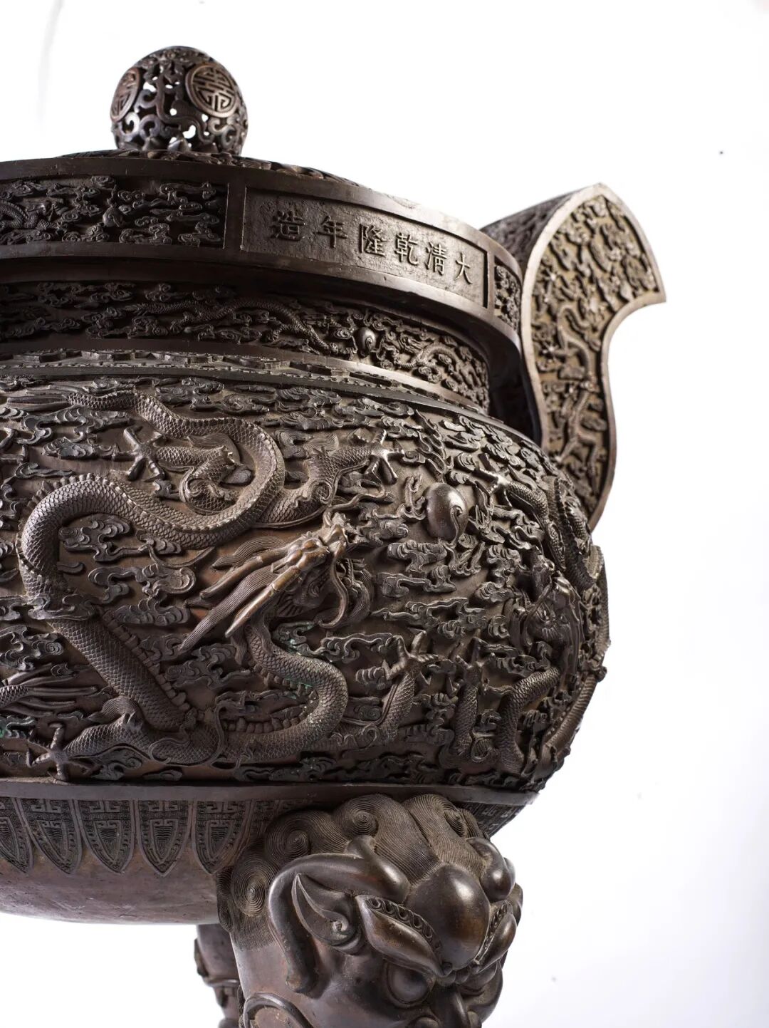 “清乾隆 御制铜铸刻二龙争珠图五供”,成组造型稳重、铸刻繁丽,尺寸巨大,总重高达735公斤。威武的游龙纹样彰显至高无上的皇权,是罕见的完整套装。