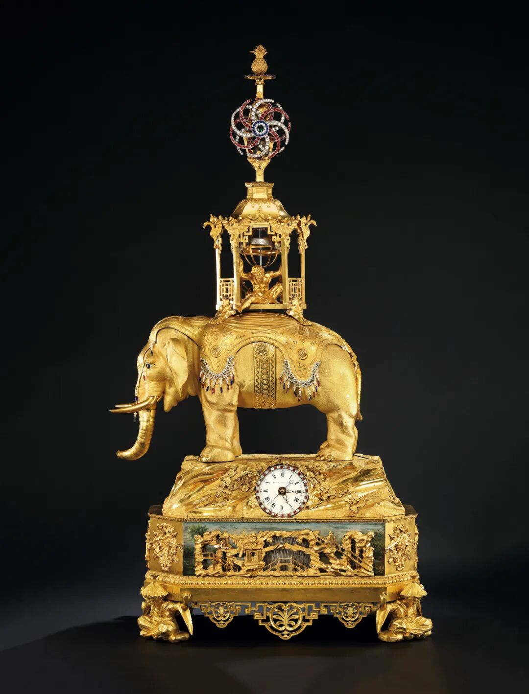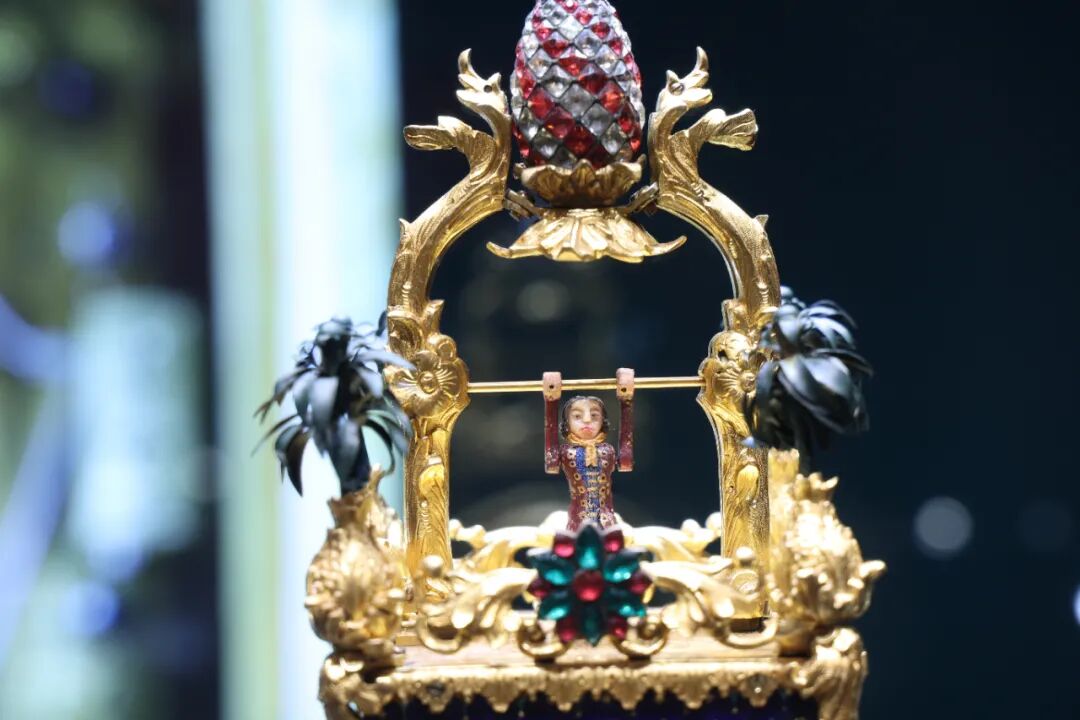特展第三章“清宫钟表”,明星展品包括“清乾隆 御制铜鎏金转花转水法大吉葫芦钟”、“18世纪 铜鎏金太平有象水法转花音乐自鸣钟”、“清乾隆-嘉庆 铜鎏金御题诗西洋游戏人物钟”、“清乾隆 铜鎏金转花西洋童子打乐钟”等。