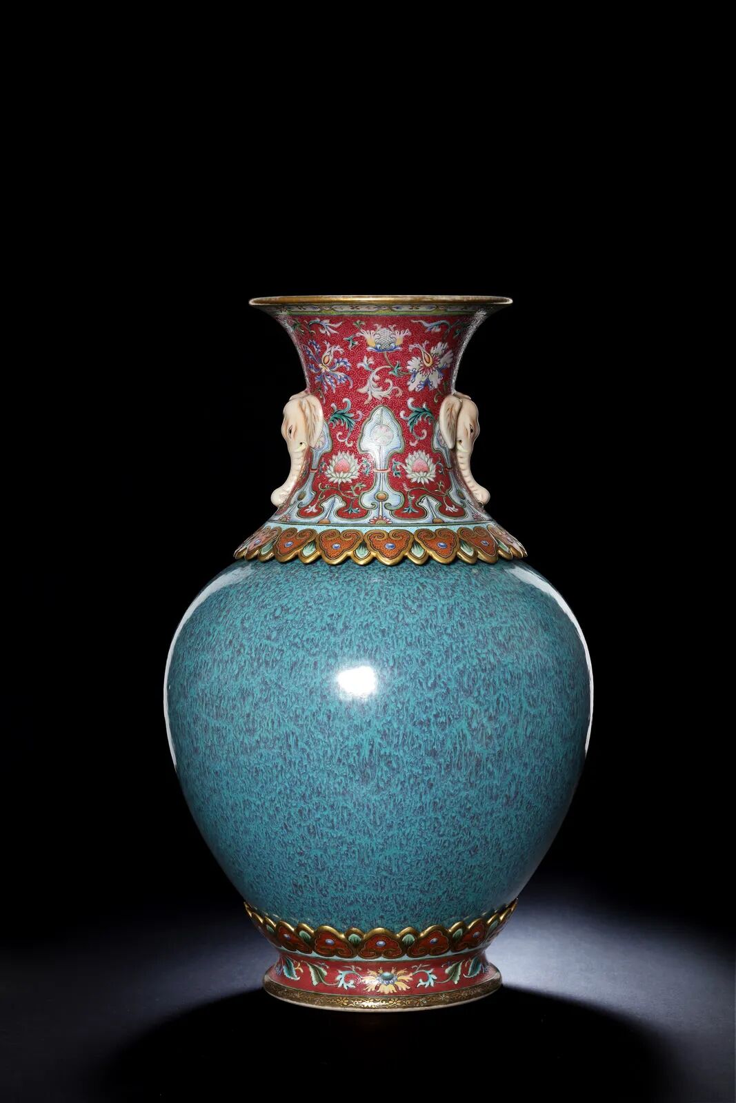 以明星展品“清乾隆 御制洋彩胭脂紫地番莲花卉套炉钧釉双象耳转心瓶”为例,它是同时期御窑瓷品中的珍罕之作。转心瓶的每一用色及纹饰精工至极,独具西洋韵味的缠枝花卉,胭脂红釉色为底的颈部,两侧收紧处饰有造型灵动的双象耳,象首的肤纹褶皱刻画极为细腻,象鼻轻垂,眼神坚毅,寓意“太平有象”之美好,为乾隆八年至十年之间所特制。底施松石绿釉青花篆书款。
