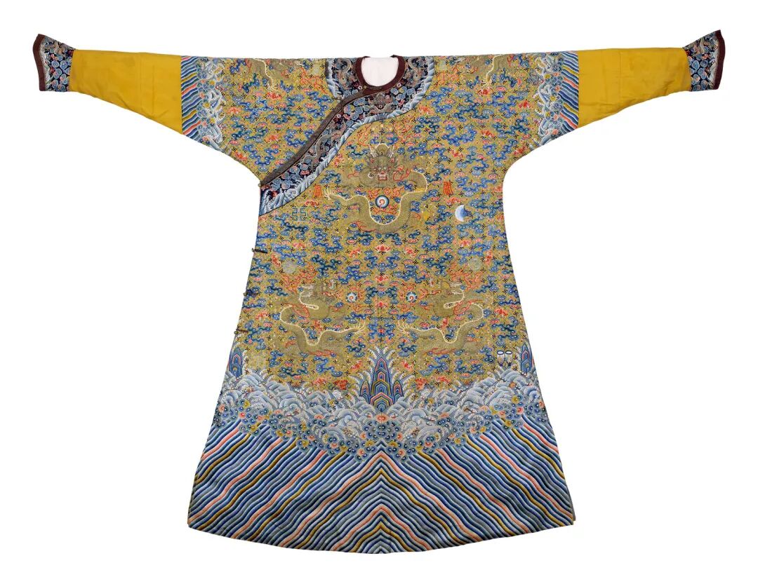 《纯惠皇贵妃油画像》中的女子雍容高贵,神情娴静温婉,正值23岁盛年,身着金黄色缉米珠八团龙冬吉服袍,头戴东珠顶吉服冠,青绒点翠嵌东珠火焰纹金饰眉勒子。按《大清会典》中记载,金黄色为妃及贵妃所专用。耳饰为一耳三钳东珠耳坠,画面四周贴明黄色织金缎细边。画中的服冠,体现了清代宫廷服饰制度的严苛,其绣工、用料以及织造都极为华美精致。