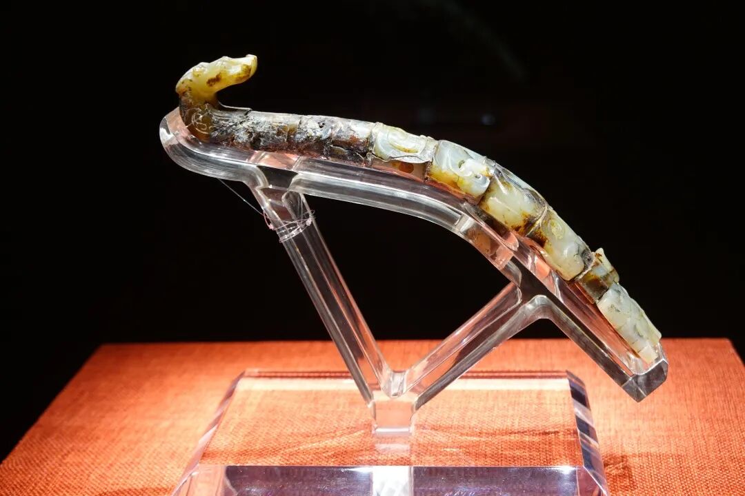 八节铁芯龙虎玉带钩由一根铁芯穿连8块玉制作而成,这种铁芯玉带钩,在秦汉玉带钩中很少见。