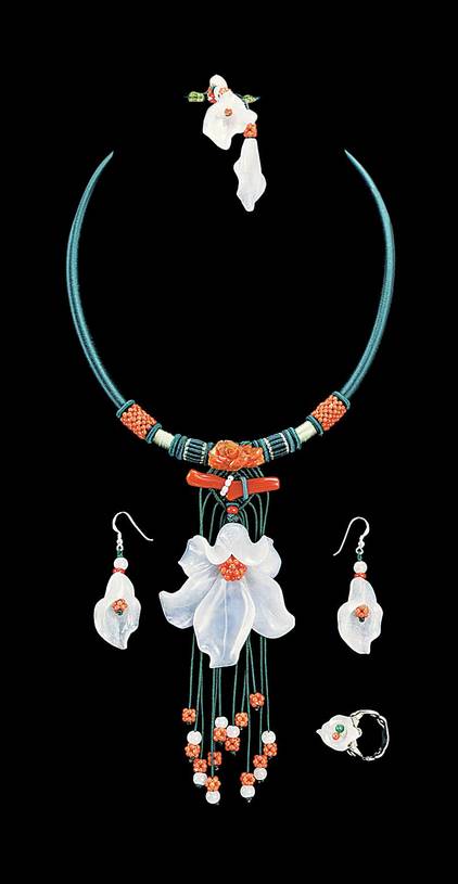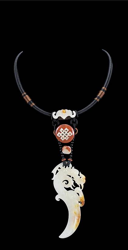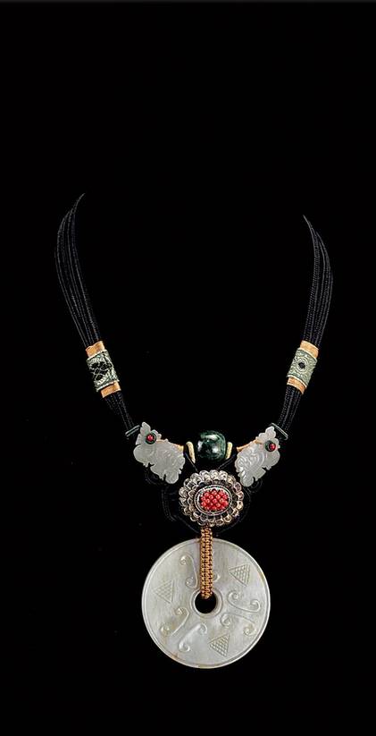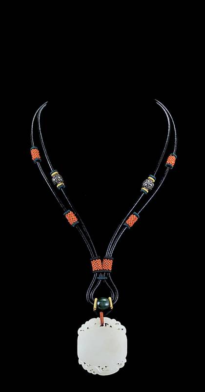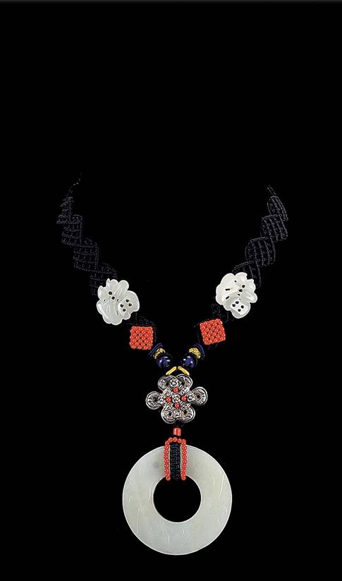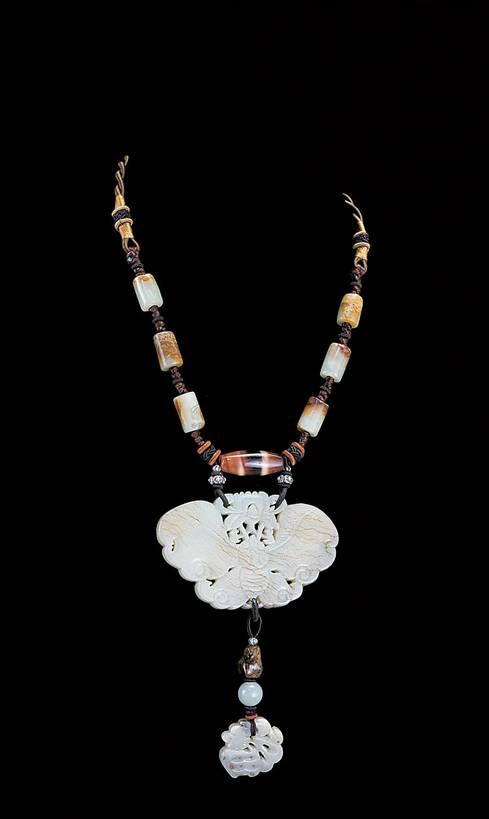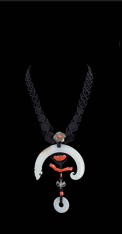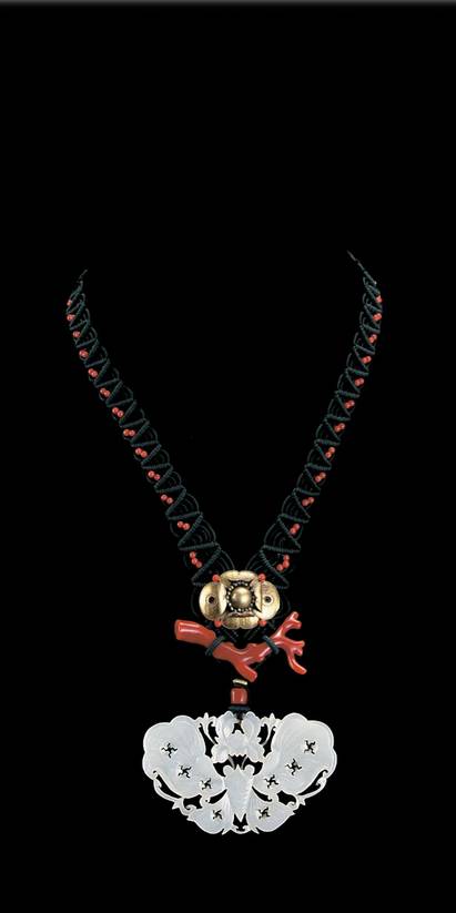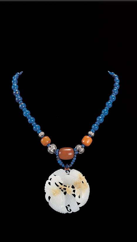 白玉镂雕一鹭莲升珮珊瑚花项饰