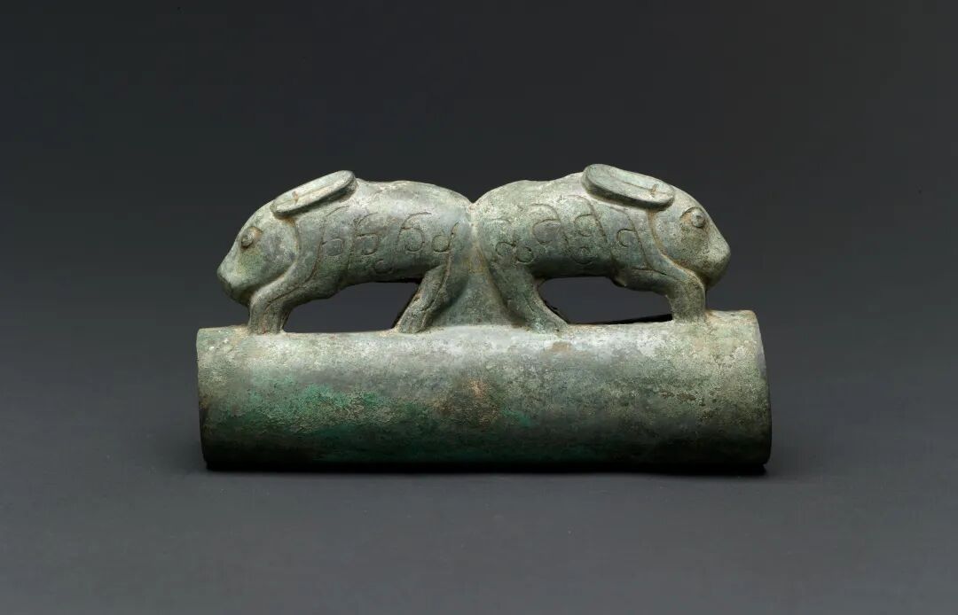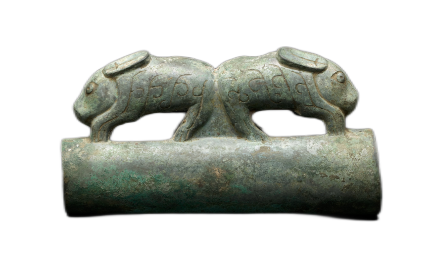 车衡通常为一根圆柱形的木棍,其主要功能是缚軛驾马。这件器物的主体呈空心圆筒状,用于插入木衡起到稳固和装饰的作用。双兔立于圆筒之上,作反向奔跑状,俯首曲肢,圆目长耳,臀部相连,腹部两侧装饰有云纹。这件车衡饰铸造精良,双兔形象写实,造型生动活泼,是西周青铜车马器中的精品。