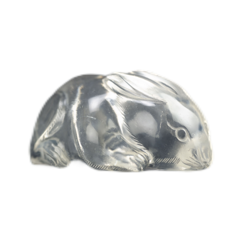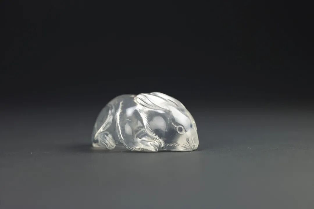 水晶兔身体呈卧伏状,四肢收屈,弓背丰臀,全身圆润饱满。鼻子、胡须和四爪均用阴刻粗线条勾勒,兔毛以平行的细短阴线刻饰,装饰性强。腹背竖穿一孔,可系可佩。整体似作觅食状,质朴敦实、憨态可掬,有唐宋遗风。
