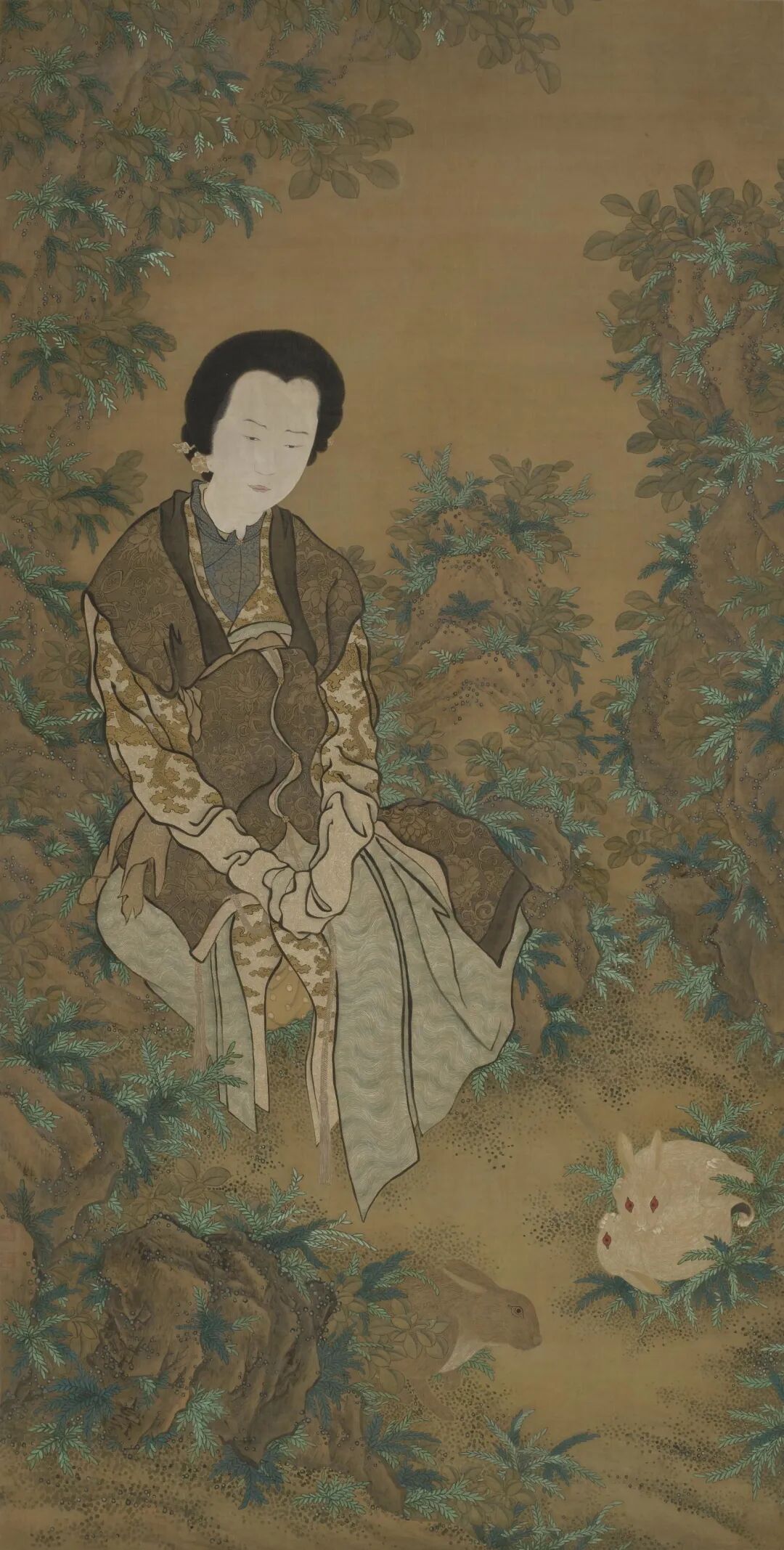 此幅作丛石草木,丽服仕女,独坐观兔。人物衣纹虬劲,多有提捺,花纹繁复,刻画细密,设色匀薄。足边三兔,似在嬉戏玩耍,两白一黑,毫毛毕现,情态可掬。