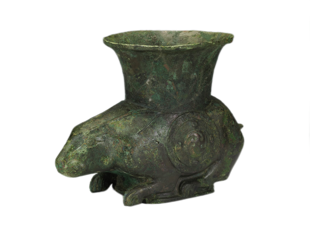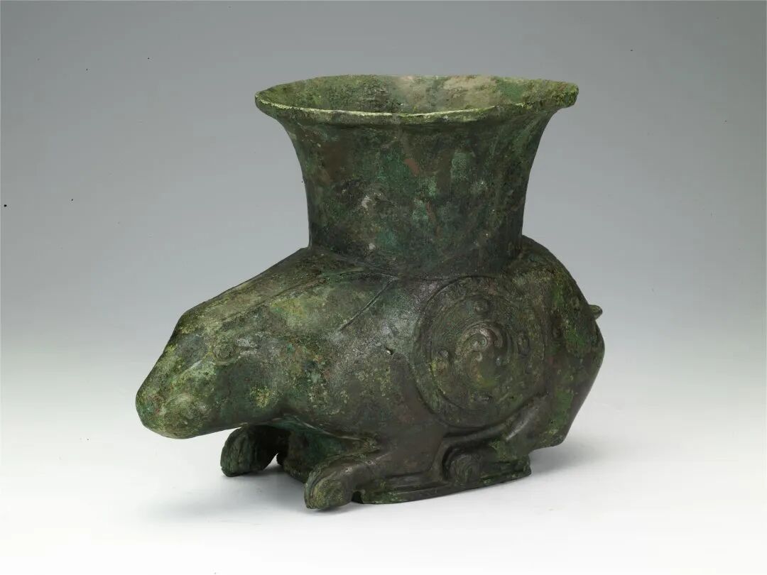 这件青铜兔尊与上博青铜展厅中著名的晋侯钟来自同一位晋侯。兔作匍匐状,双目前视,两耳向后并拢,四腿蜷曲,腹部中空。兔身两侧饰三层依次凸起的圆形纹饰,由里向外依次是涡纹、四目相间的斜角雷纹和勾连雷纹。以兔作为尊的器形,在青铜器中较为罕见。
