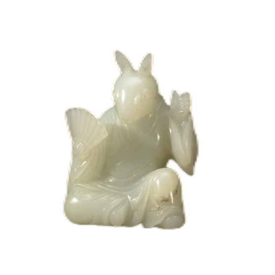 玉兔尖嘴、圆眼、竖耳,身着交襟宽袖长袍,曲膝半趺,右手持折扇,左手握拳上举。整器集圆雕、阴刻、浅浮雕等多种技法于一体,雕琢精巧,玉兔支神摇扇持物,怡然自得。