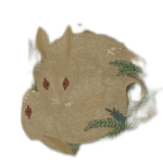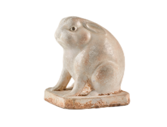 这件白釉兔,兔蹲踞于八边形台座之上,昂首前视,双耳后抿。通体施白釉,台座底部露白胎微泛黄,兔眼点褐彩。巩义黄冶窑窑址曾出土造型相近的素胎残件,结合胎釉特征判断此件器物当属巩义窑产品。