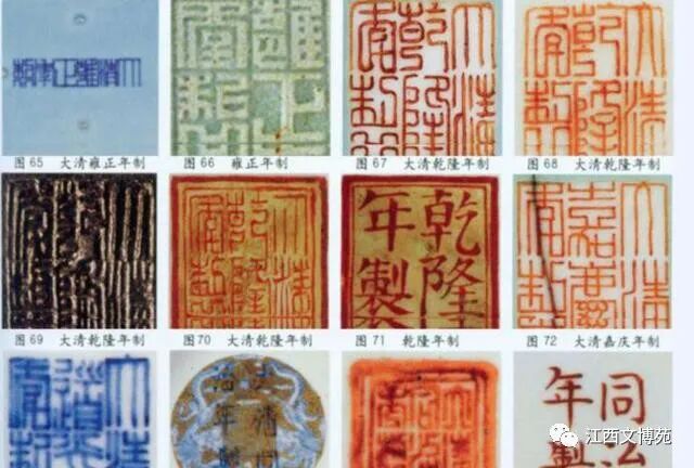 除了瓷器的款识笔法,款识的字体也需要注意。大致来说,在字体方面明代多用楷书款,清代顺治、康熙二朝亦为楷书盛行时期,雍正则楷书款多于篆书款,由乾隆开始,篆书款多于楷书款,嘉庆以后篆书款遂成为主流,至到清末才又恢复以楷书视为主体的趋势。图为大清乾隆年制真品款识。