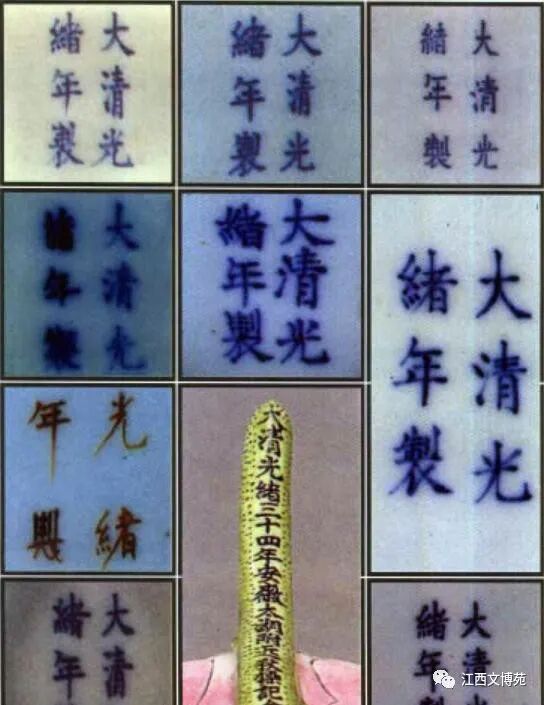 因此研究各代款识,首先要注意其款识笔法,如横、竖、撇、捺、勾、挑、点、肩等八笔的特征,都须认真加以领会和对比,并从中加以总结和归纳,由款识的真伪来判断瓷器的真伪,并以此作为鉴别瓷器真伪的参考。图为大清光绪年制真品款识。
