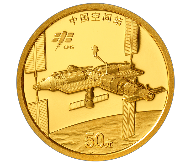 3克圆形金质纪念币背面图案为中国空间站外观。