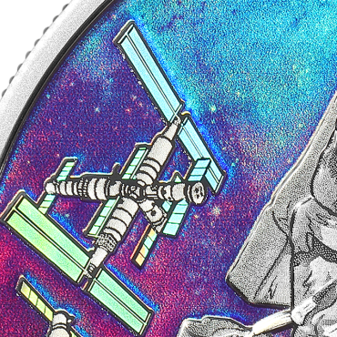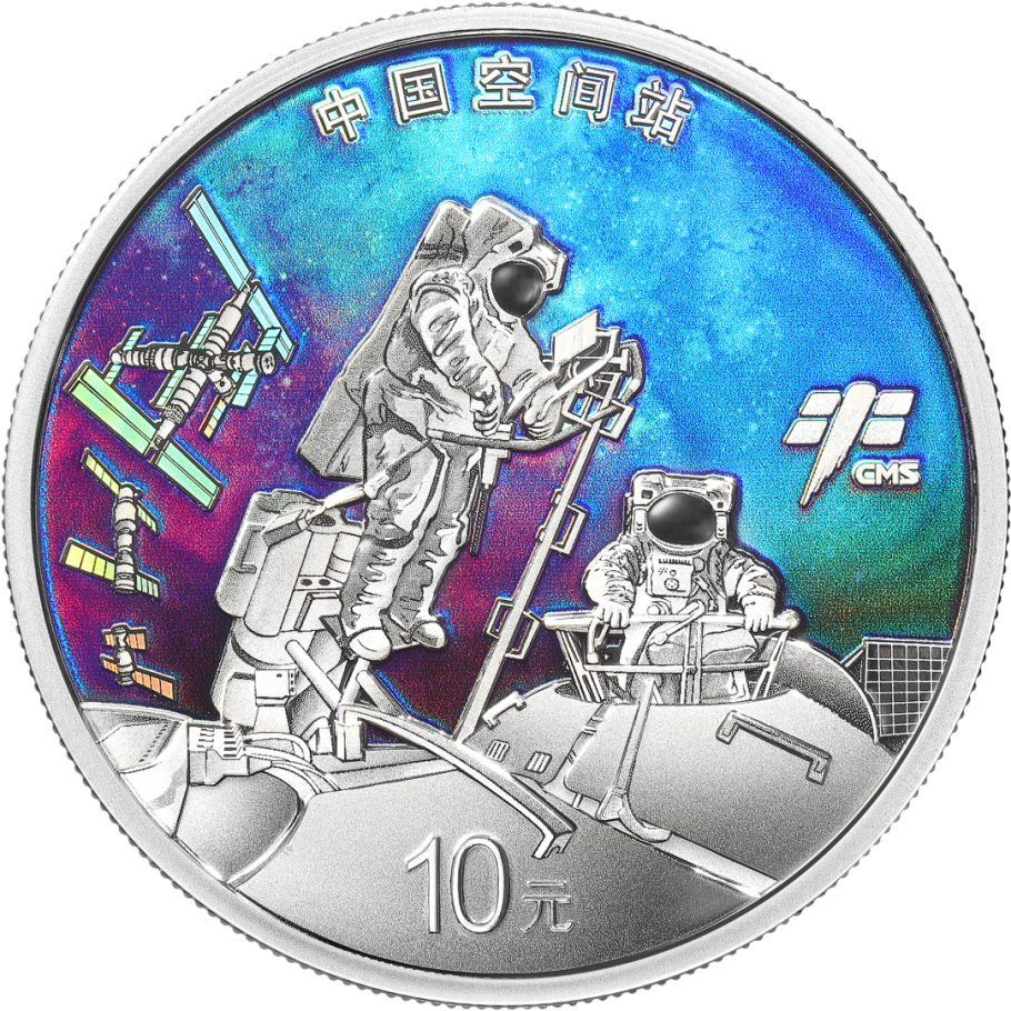 30克圆形银质纪念币背面图案为中国航天员在中国空间站舱外活动场景。