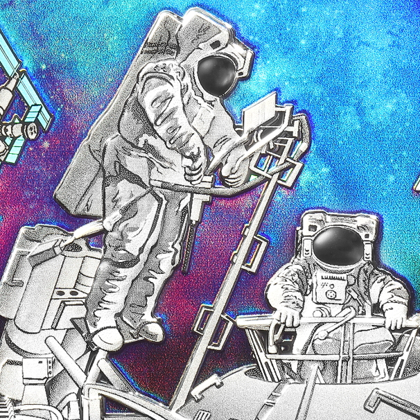 多层次喷砂工艺将宇航员出舱作业的状态刻画得真实立体,让我们为中国航天加油!
