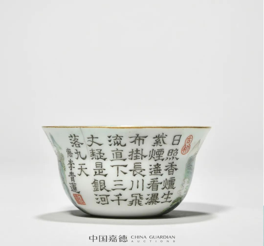 清道光 粉彩江西十景之庐山瀑布山水楼阁诗文折腰卧足杯