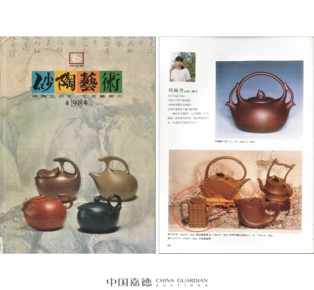 当代 周锡芳制POTTERY ARTS定制香港回归纪念壶钤印:周、锡芳、香港区徽logo、POTTERY ARTS定制logo(底款);周、锡芳(盖款);周(把款)题识:1897-1997(盖面一);香港回归纪念(盖面二);香港回归纪念(壶身)参阅:《砂壶艺术1998》第186、237页,图之8,紫玉金砂有限公司出版,1997年12月。参阅:《钰壶雅集》第13、16页,五行图书出版有限公司出版,1994年10月