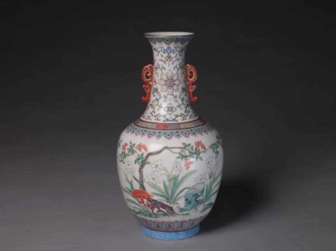清道光 粉彩花卉榴开百子图双螭耳瓶