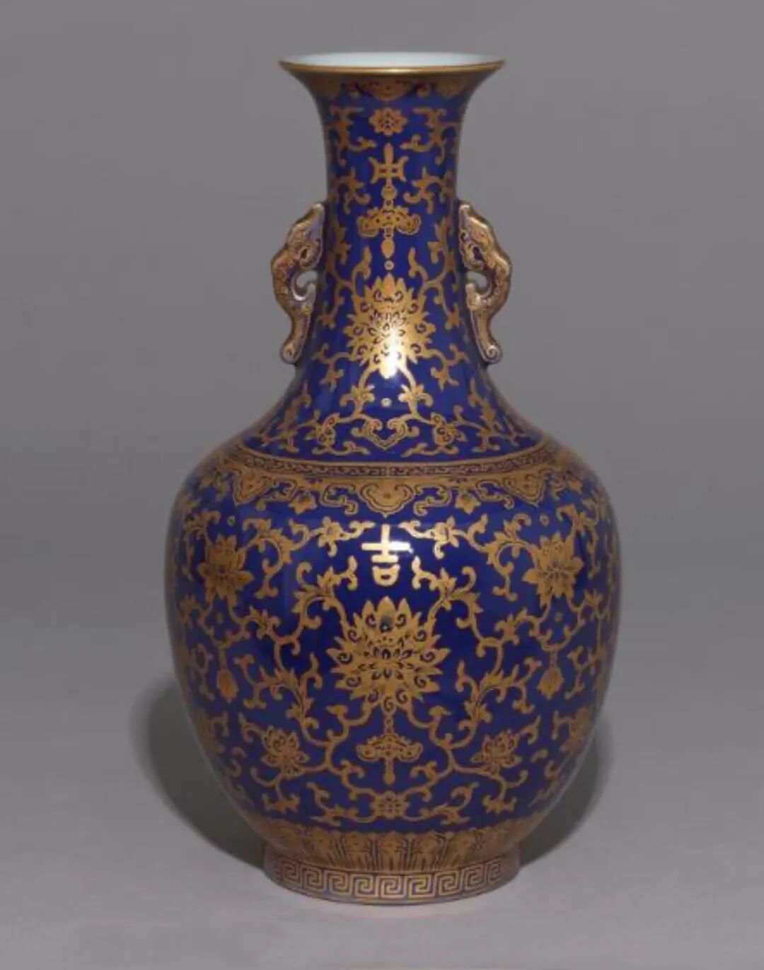 清道光祭蓝地描金缠枝莲纹螭耳瓶