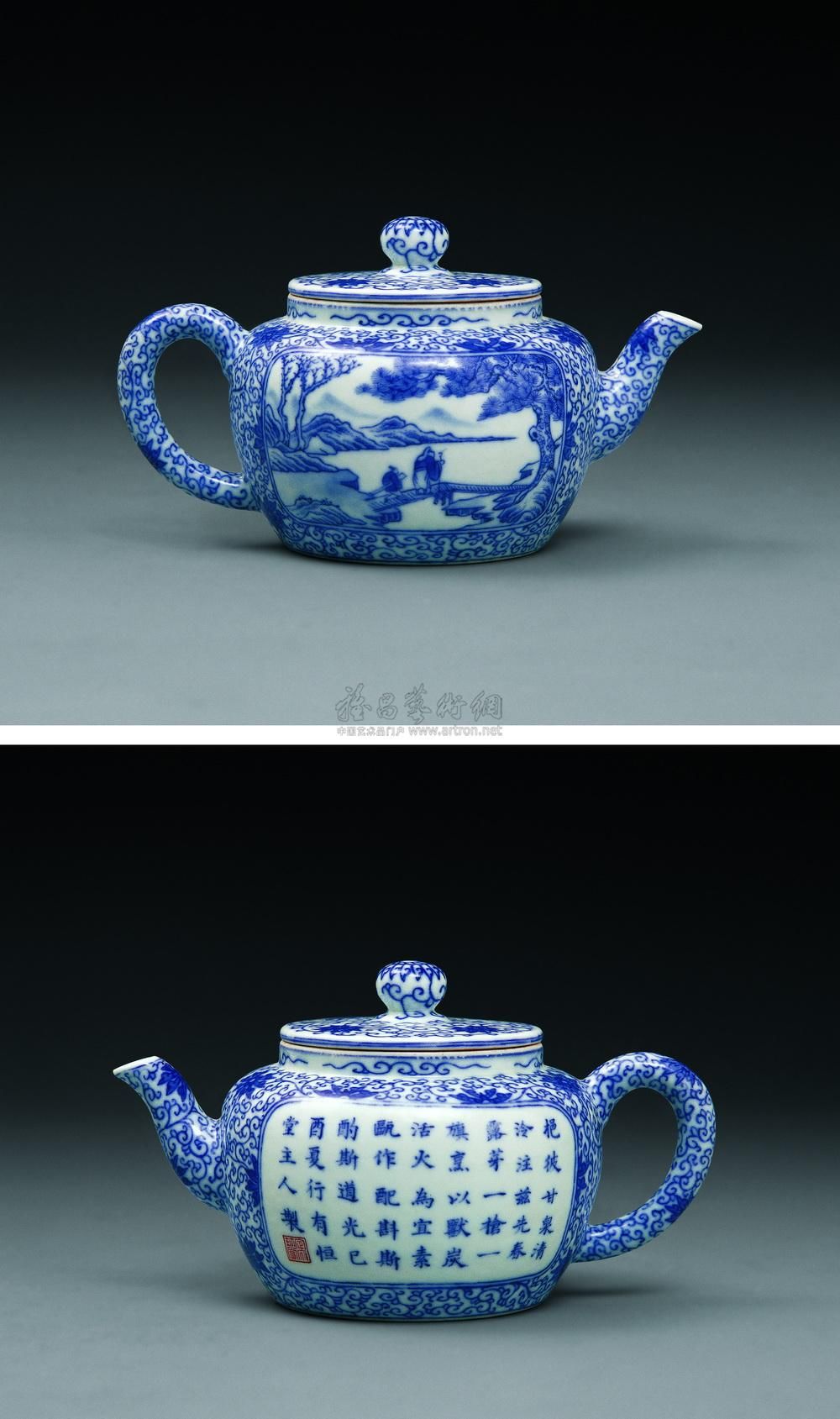 清道光 行有恒堂御诗青花开光山水人物纹壶