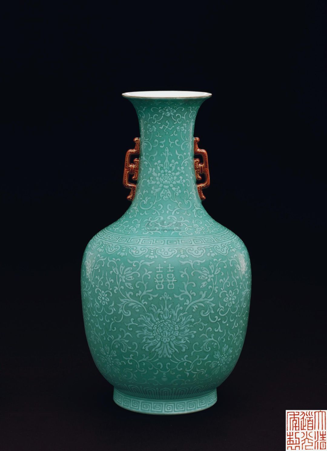 清道光 松石绿釉堆白缠枝莲纹喜字瓶