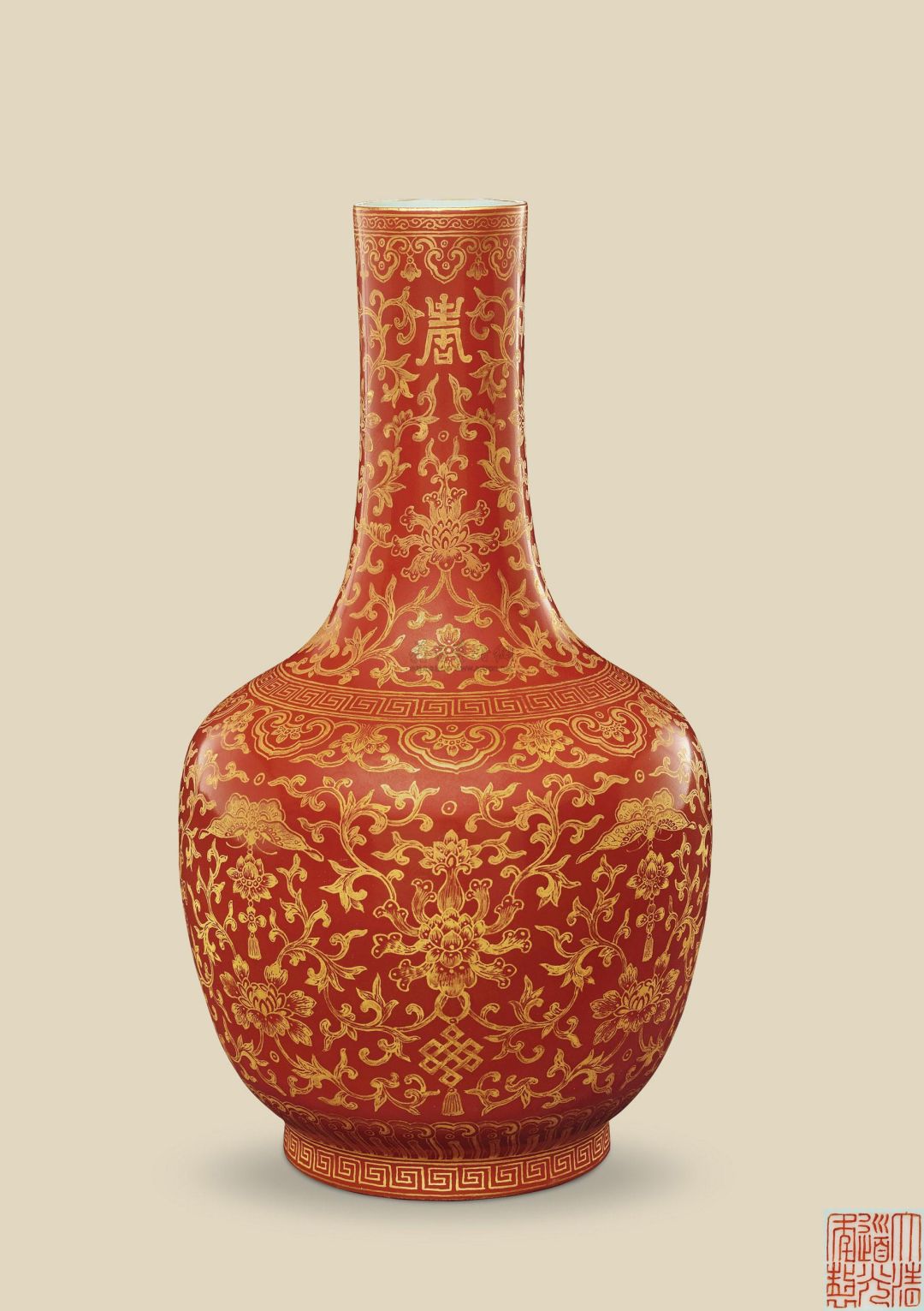 清道光 珊瑚红描金宝相花寿字纹瓶