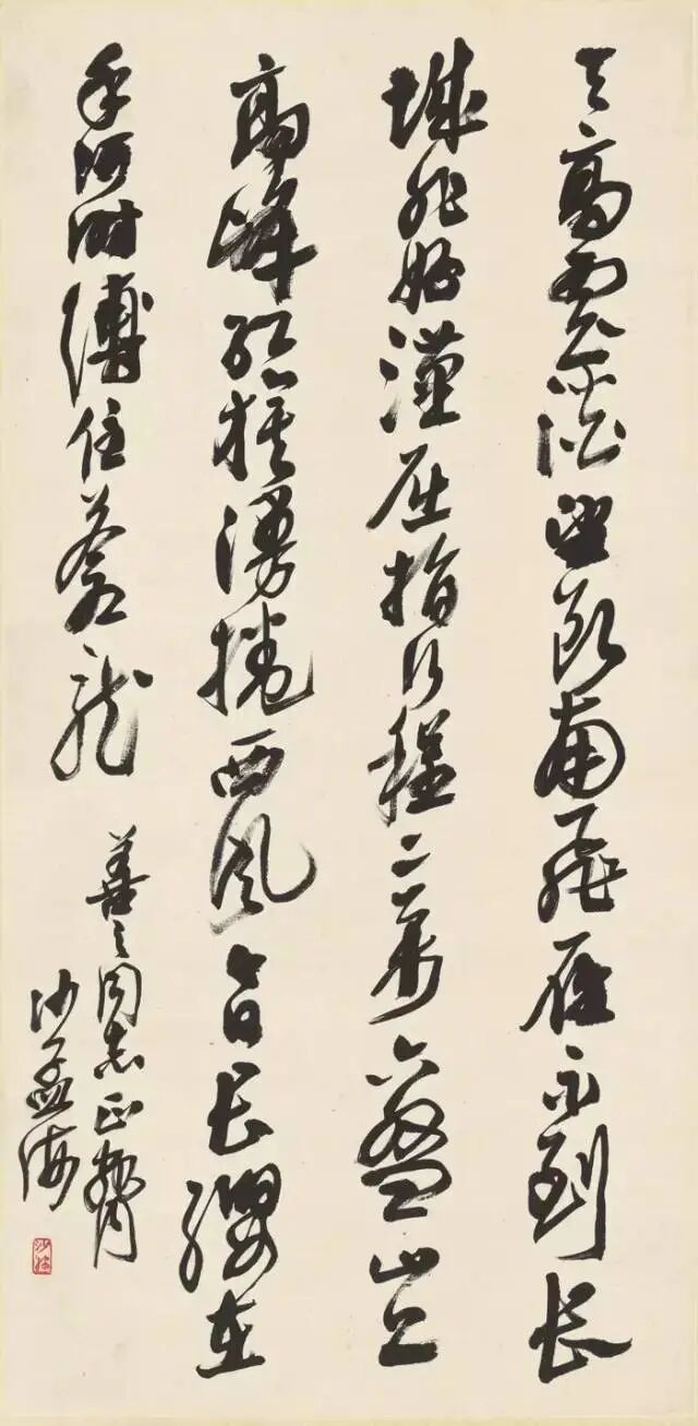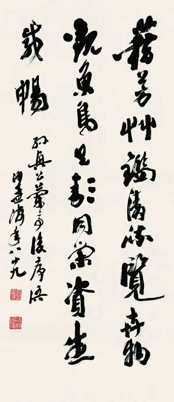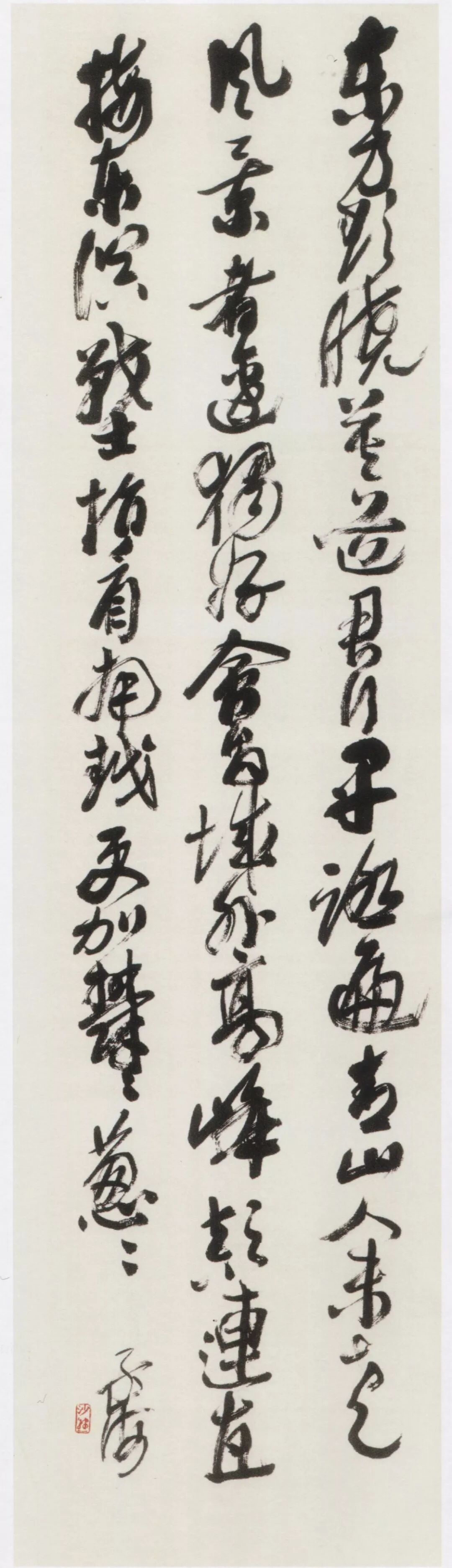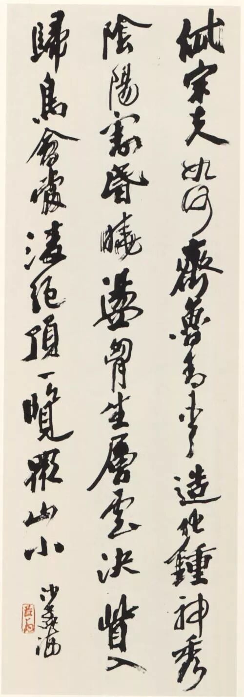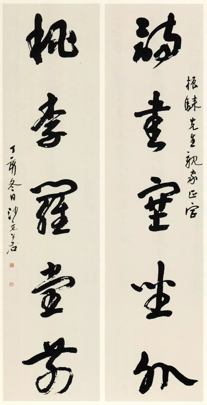 钤印:孟翁(押)沙孟海《行书天空阁回五言联 》纸本 133×31cm×2释文:天空湖是月,阁回树为雲。——天一阁主人范东明司马旧句。沙孟海年九十。沙孟海《行书毛泽东诗轴》 124×31cm 沙孟海书学院藏