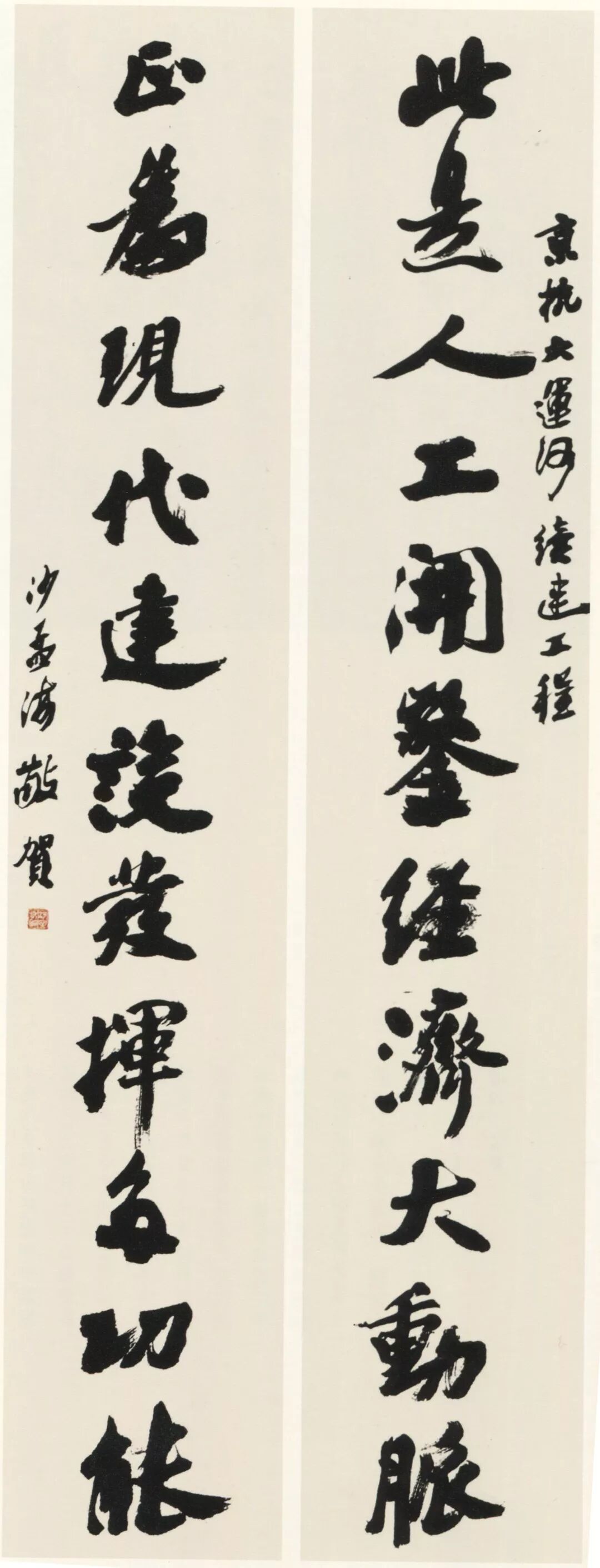 钤印:沙(朱押)沙孟海《京杭运河续建工程十一言联》 180×32cm×2 1987年