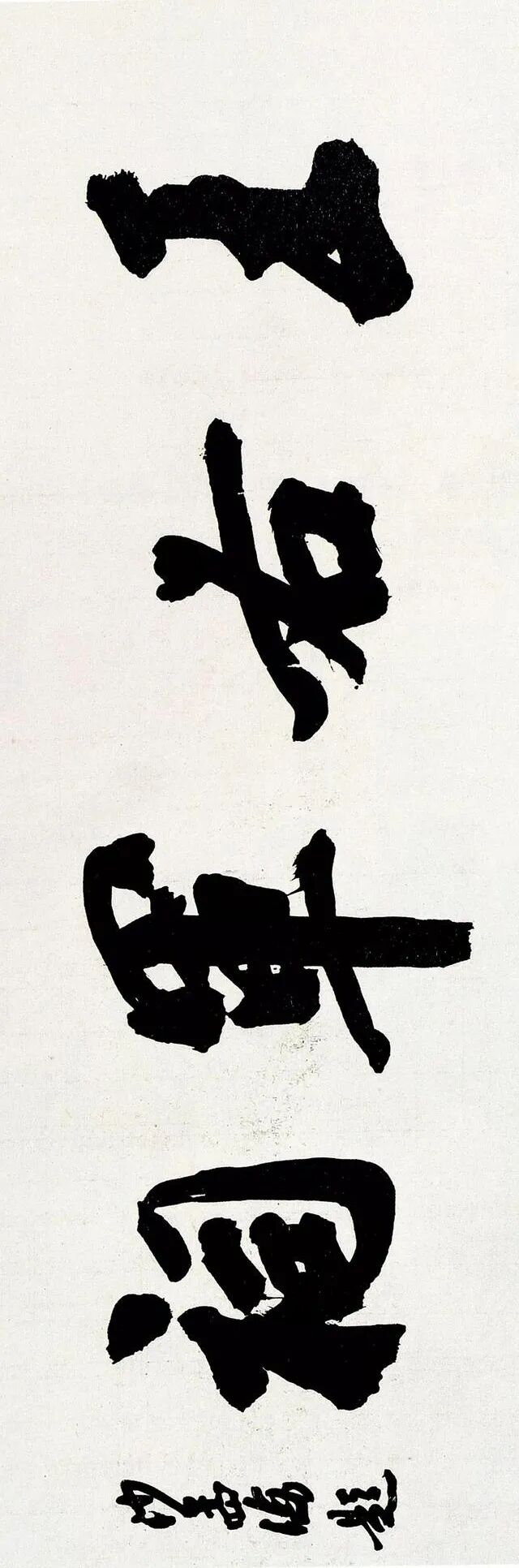 沙孟海《七言联》浙江省博物馆藏沙孟海最为后世所知与认可的,当数他的榜书。榜书,古称署书,即题在宫阙门额上的大字。其大字用笔横扫,出入自如,结体险劲逼仄,构成上点、线、块、面对比强烈,空间感、现代感极强。用墨更趋浓重,苍老、生辣、遒劲,气酣势疾,刚健有力,韵味沉厚,卓然成家,“真力弥满,吐气如虹。海内榜书,沙翁第一”。沙孟海《安吉县博物馆》行书题标 109×19.5cm安吉县博物馆藏沙孟海《陆羽泉》行书题标 66×22cm 1990年 浙江省博物馆藏沙孟海《万罗山》行书题标 64×22cm 1991年 浙江省博物馆藏沙孟海《中雁荡山》行书题标 72×22cm1991年 浙江省博物馆藏沙孟海《凤凰大桥》行书题标 66×22cm浙江省博物馆藏沙孟海《马一浮先生墓碑》行书题标 77×53cm1988年 浙江省博物馆藏沙孟海《医药大楼》行书题标 66×22cm浙江省博物馆藏沙孟海《临池一助》行书题字220×150cm个人藏沙孟海《屈铁画沙》行书题字 37×28cm1987年 个人藏沙孟海《行书听鹂深处横幅》 29×129cm 1985年浙江省博物馆院藏