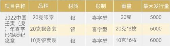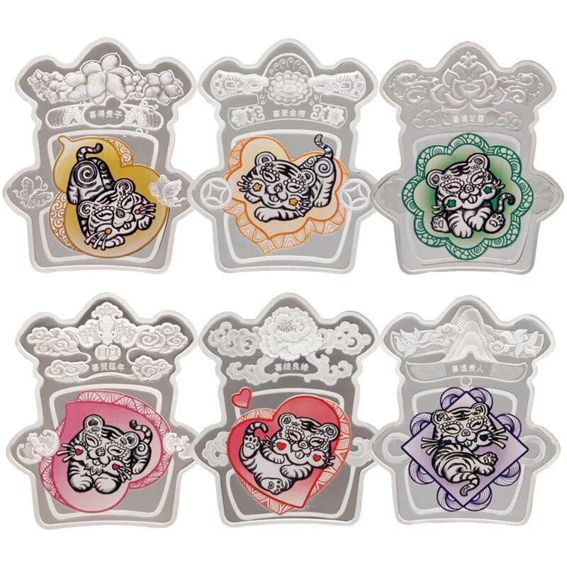 这套虎年喜金银章整体造型采用“喜”字形设计,加上每一枚纪念章上都带有“喜”字的成语,把它带回家岂不是双喜临门?![]()