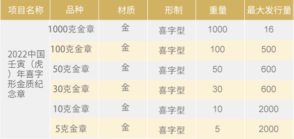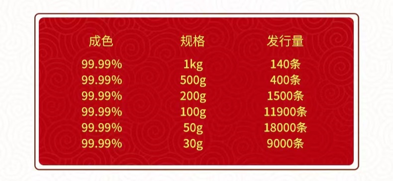 此次发行的贺岁金条共有6种规格,分别为1000克、500克、200克、100克、50克和30克规格,成色99.99%,发行总重量3000千克,每种规格发行量如下:![]()