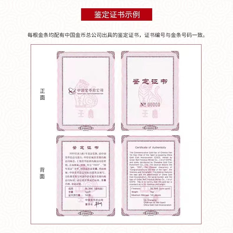同时每枚金条都配备金总的鉴定证书,证书编号与金条号码一致,确保一物一码,每一处细节都展示出金条的官方、权威、品质!