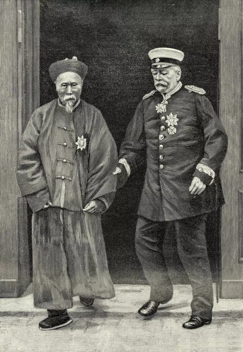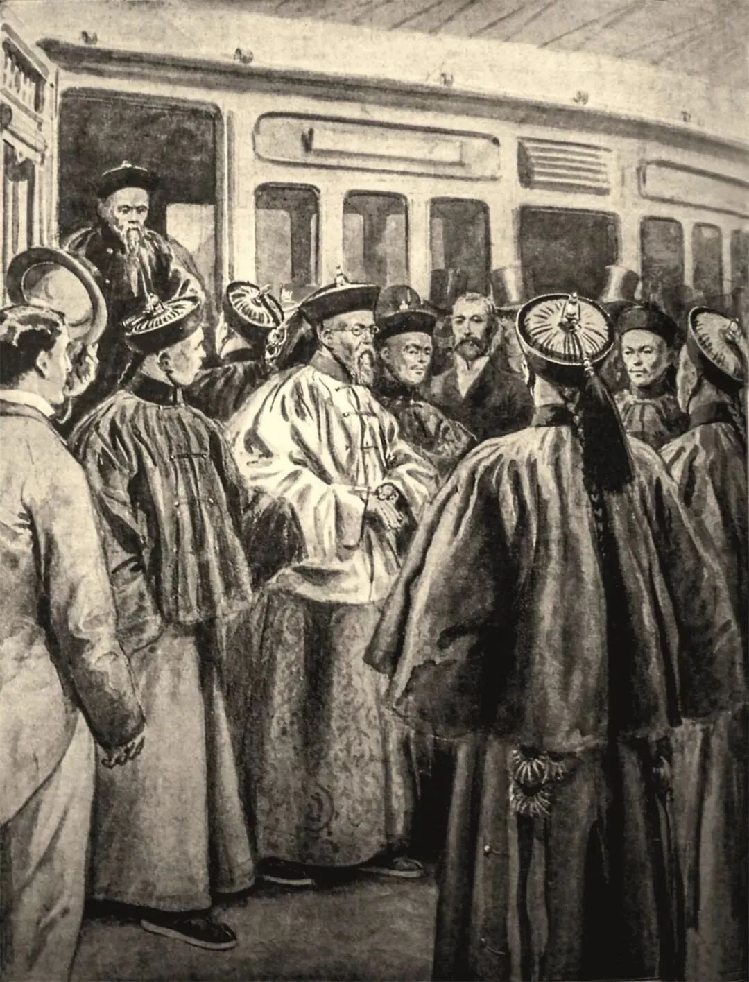 ▲1896年,俄国沙皇尼古拉二世举行加冕典礼,李鸿章奉命前往祝贺。典礼结束后的6月13日,李鸿章乘列车开始了他的欧洲访问之行,首站便是德国。图为俾斯麦与比他小8岁的李鸿章一起走出门。此图根据照片绘制而成。