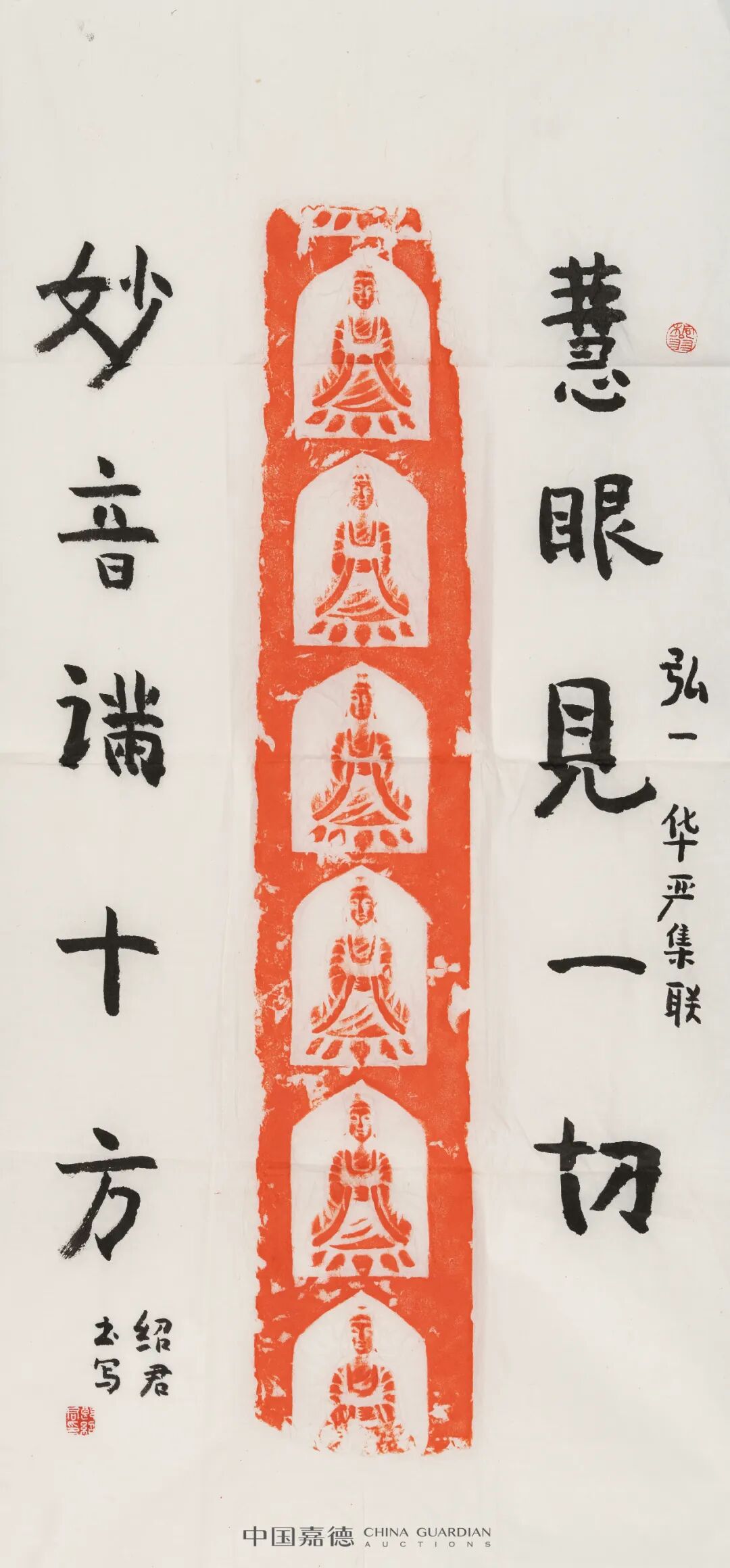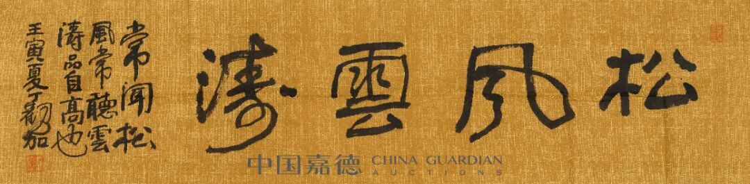 说明:附作者与本拍品合影照片。题识:光明无量。智慧宏深辟如巨海,菩提高广喻若须弥。壬寅八月,吉舟居士石开。题识:常闻松风,常听云涛,品自高也。壬寅夏丁观加。释文:慧眼见一切,妙音满十方。