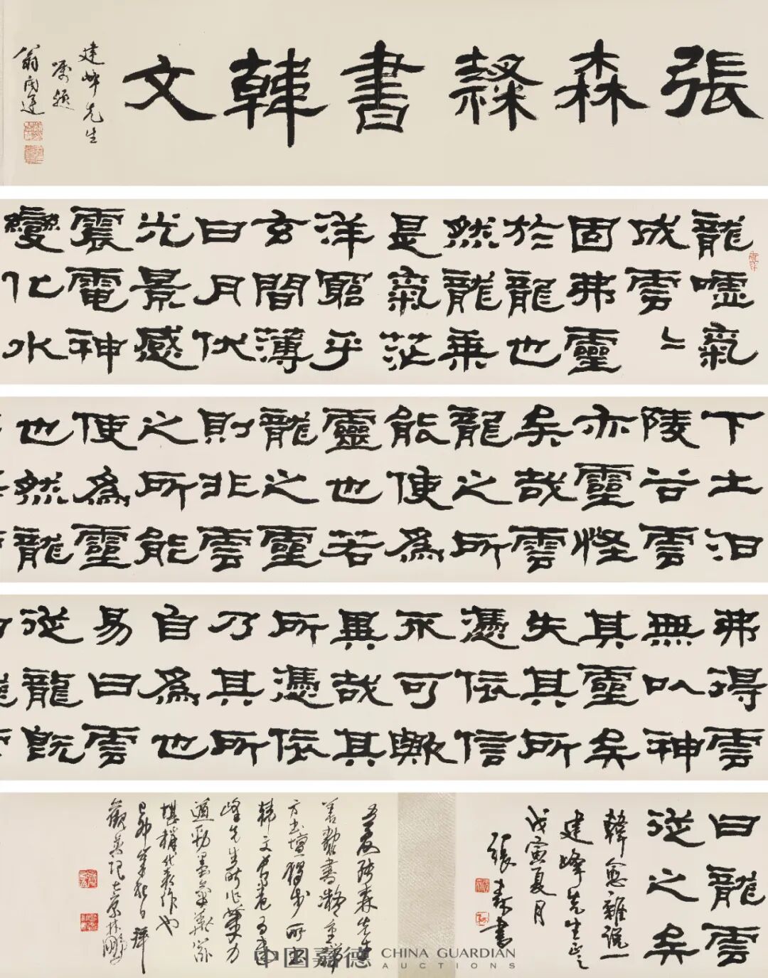 林鹏题跋:吾友张森先生善隶书,凝重端方,书坛独步,所书韩文长卷为建峰先生所作,笔力遒劲,墨气华严,堪称代表作也。己卯(1999年)岁秋日拜观并记。七康林鹏。钤印:夏屋山