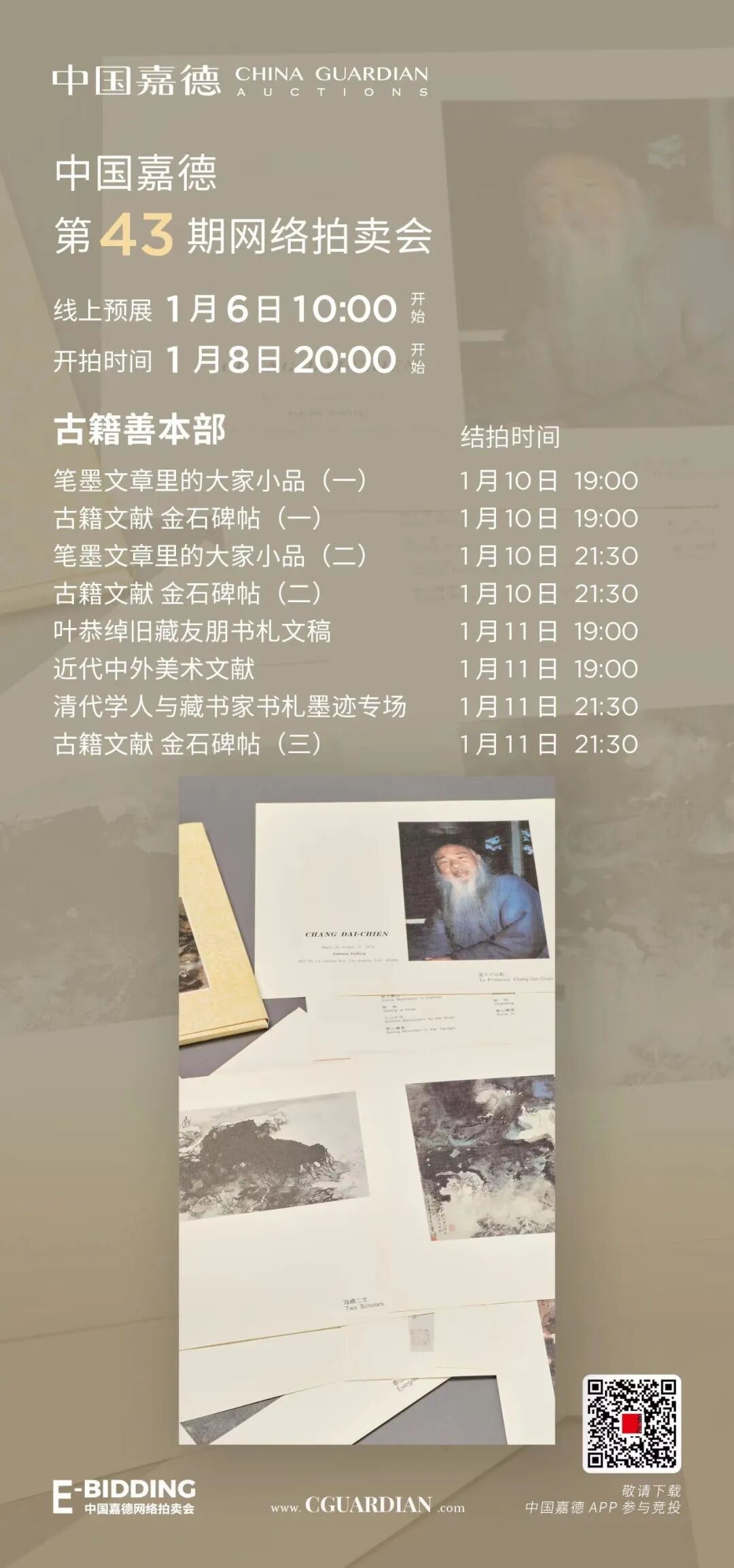 中国嘉德第43期网络拍卖会古籍部征得近代中外美术文献70套,涵盖了张大千、齐白石、溥心畬、傅抱石、黄宾虹等近现代名家作品画作出版物,既可作为学习之资料,又可以作为收藏之参考。此外,海外中国古代、近现代书画图录,既包括341册之各时期各专场图录,又包括市场上推崇备至的名家专场图录,皆可作为艺术品爱好者的收藏门径与竞购参考。![]()
