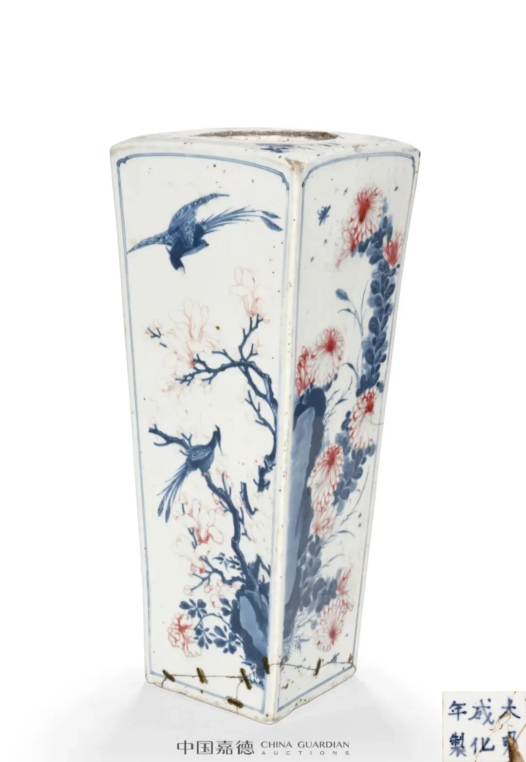 此式器型《明清瓷器鉴定》中称“方棒槌瓶”,应由棒槌瓶化裁而来。天圆地方瓶常见有青花、五彩装饰,装饰纹样多见山水人物纹,而若本品装饰釉里红四季花卉较为少见。本品之釉里红妍而不俗,秀而不媚呈色稳定,发色娇艳,令人赏心悦目。本品外壁颈部肩部暗刻蕉叶纹、云蝠纹,腹部开光内青花釉里红绘梅竹诗文,近足处暗刻海水纹。从工艺角度而言,本品集单色釉、暗刻、堆塑、青花、釉里红等多种装饰工艺于一体,器形端庄,发色完美,体现了乾隆时期景德镇瓷艺技术的成熟。从装饰角度而言,本品集诗、书、画于一体,构思巧妙,立意高雅,兼具文人意趣和吉祥瑞意,实为一件不可多得乾隆文人瓷绘精品。![]()