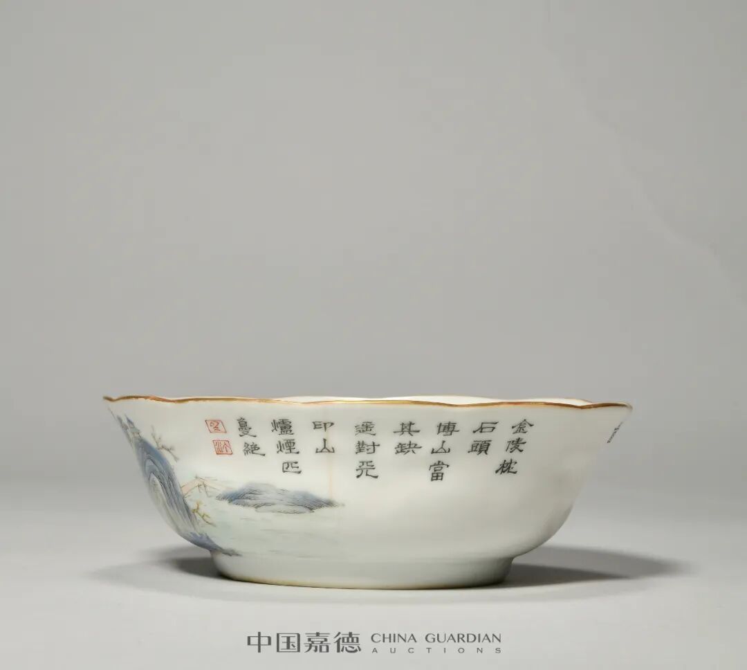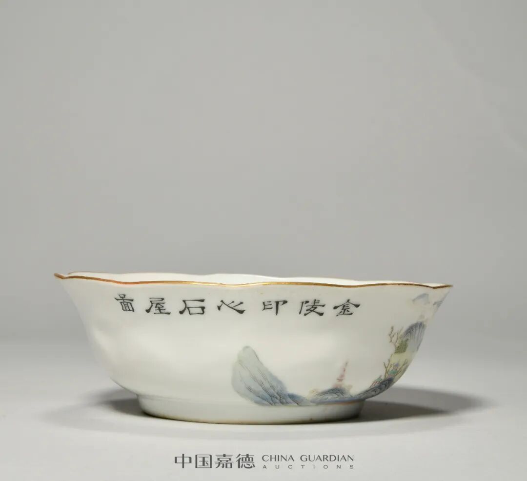 清道光十七年(1837年) 粉彩印心石屋山水楼阁诗文花口碗题识:“金陵印心石屋图”、“金陵枕石头,博山当其缺。遥对天印山,炉烟匹曼绝”、钤印“云”、“汀”、“道光丁酉(1837年)”款![]()