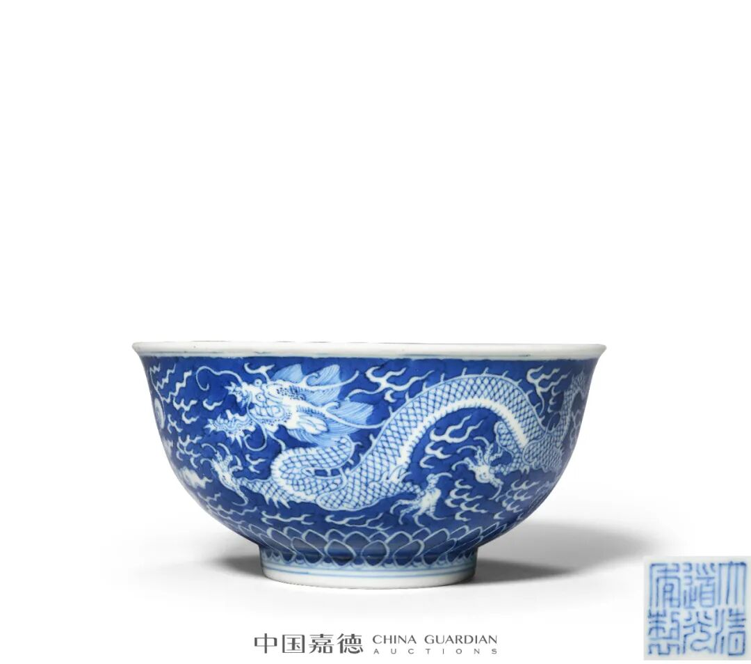 来源:中国嘉德2016年6月18日拍卖会第2427号碗内外壁均以青花留白方式进行装饰,青花留白的装饰技法应为元代初创,以青花涂绘地色,衬托反白纹饰,装饰技法独特。碗心绘五爪云龙纹,外壁绘戏双龙戏珠,青花浓淡层次分明,为标准道光官窑器。八卦云鹤纹样肇始于道教盛行的嘉靖朝,从此即成为官窑经典纹饰流传后世。清代御窑习惯将八卦云鹤纹以青花技法绘于碗上,以晚清作品最为多见。![]()