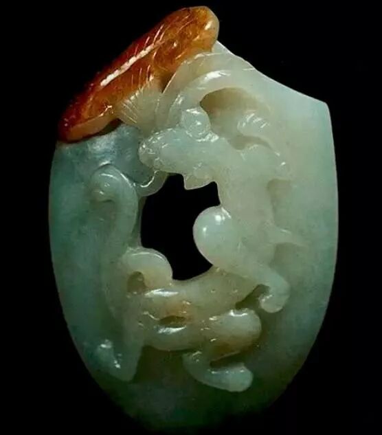 沁色也是古玉老相的特征(图四)。玉器长年埋于地底发生质变,而让周遭其他元素离子渗透而入,造成颜色的变化,叫做「沁色」。古玉受沁并不影响它的质地质感,它也会有油光包浆的,而且越盘越温润。好的沁色有好的色泽和通透感,自然能增加古玉器的赏玩价值。沁色和「留皮雕」(图五)、「提油」(图六)有很大的不同。是出土的老古玉才有机会受沁,留皮雕只是玉器雕制时,保留原石部份不同颜色的表皮,做为玉器的一部份。「提油」简单说就是做色染色。这两者并不能表示老相,虽然古玉器有时也会有这般的做法,这是初学者最容易混淆的地方。