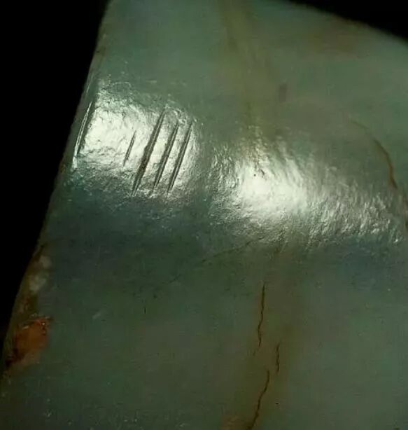 皮壳通常跟随着油光,人体皮肤是越老越干涩,但玉器年代越久越显油润。上好玉料如和阗玉若雕琢打磨良好,只要上百年即有温润通透似果冻的感觉,是所谓的「 包浆皮壳」。如果年代上代(汉代)了,又曾 经快速打磨过,则有机会看到「玻璃光」(图 二)。