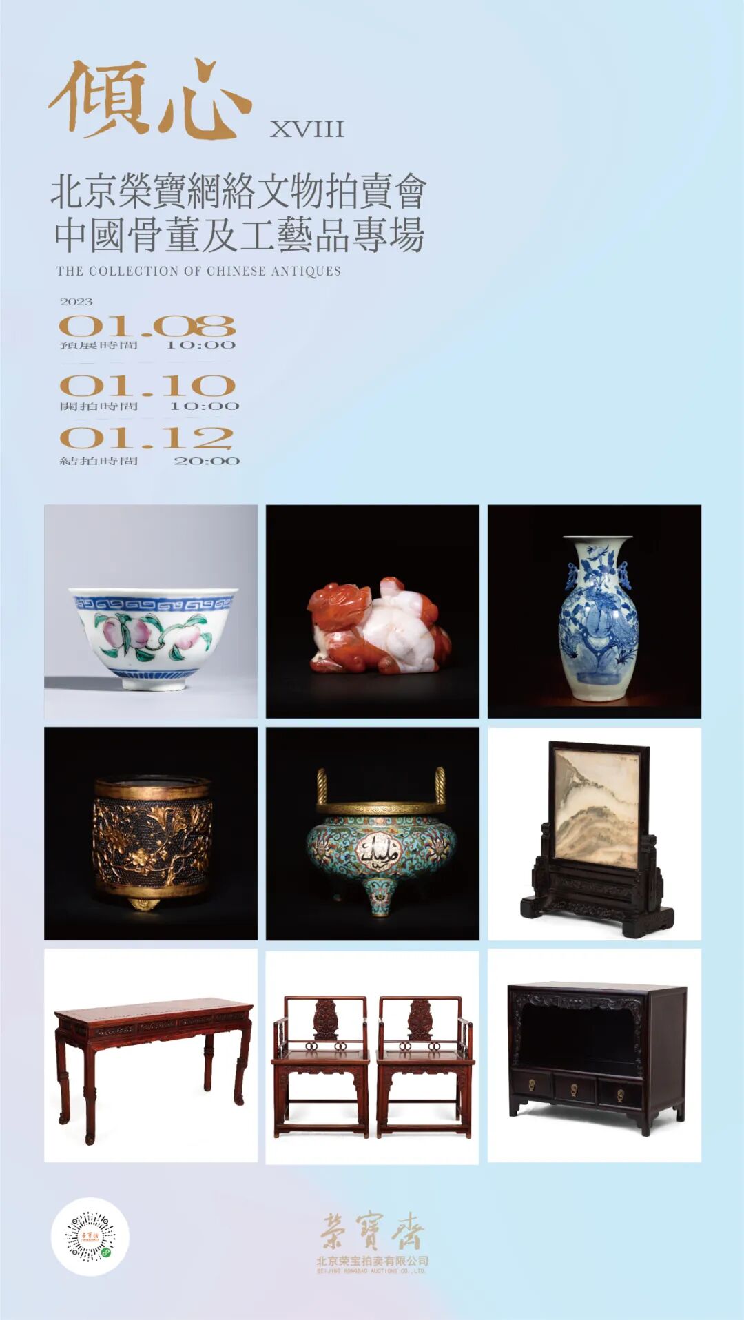 北京荣宝——倾心(XVIII)·中国古董及工艺品专场网络文物拍卖会将于1月8日10:00—1月10日10:00开启线上预展,并于1月10日10:00开拍,1月12日20:00结拍。