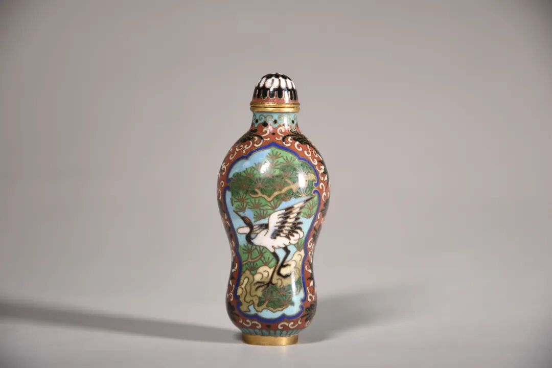 清 铜胎鎏金松鹤纹景泰蓝鼻烟壶