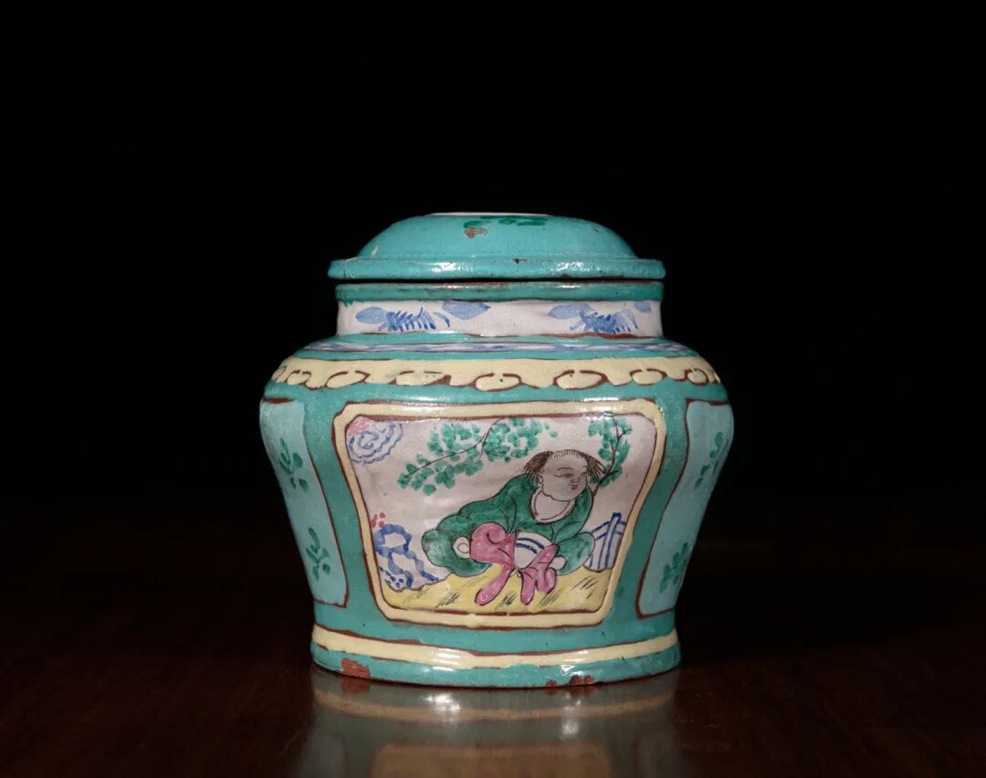 清光绪 宜兴紫砂料彩开光人物花卉盖罐